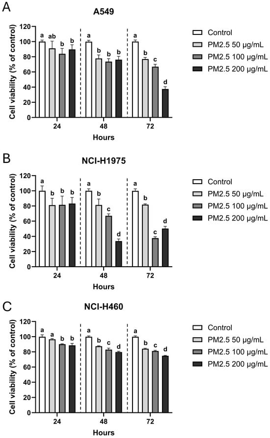 Dose- and time-dependent reduction of NSCLC cell viability after PM2.5 exposure. (A) A549, (B) NCI-H1975, and (C) NCI-H460 cells were exposed to 0 (vehicle control), 50, 100, and 200 µg/mL PM2.5 for 24, 48, and 72 h. Cell viability was measured by MTT assay and expressed as percentage of untreated control. Data are presented as mean ± SD from six replicates. Within each time point, groups sharing the same letter are not significantly different, whereas groups with different letters differ significantly (p < 0.05).