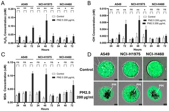 Biomass haze-derived PM2.5 induces ROS accumulation and oxidative damage in NSCLC cells. Relative levels of (A) hydrogen peroxide (H2O2), (B) hydroxyl radicals (•OH), and (C) malondialdehyde (MDA) were measured in control cells and cells exposed to 200 µg/mL PM2.5 for 24, 48, and 72 h. Values were normalized to cell viability. (D) Representative H2DCFDA fluorescence images show intracellular ROS staining; PM indicates particulate matter (PM2.5) visualized within the cells. Data are presented as mean ± SD from at least three independent experiments. Statistical significance (determined by unpaired t-tests): * p < 0.05, ** p < 0.01; ns = not significant.