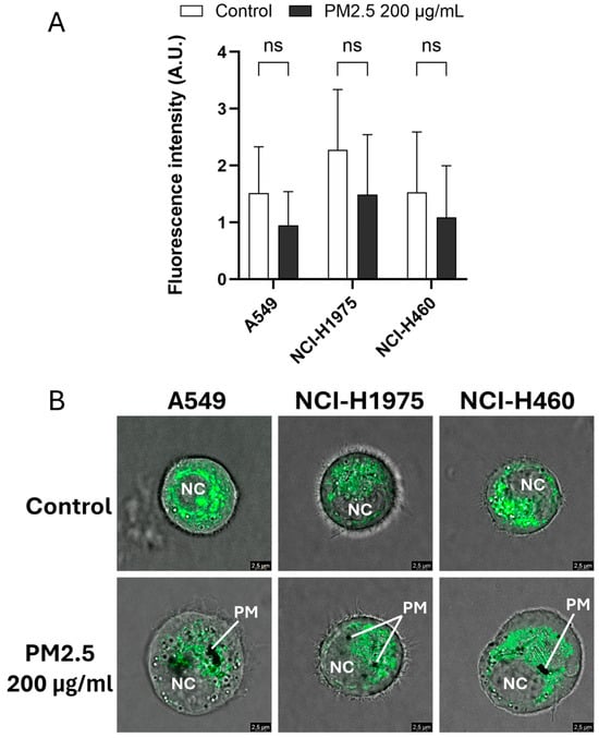 Mitochondrial status was assessed using MitoTracker™ Green FM fluorescence after exposure to biomass haze-derived PM2.5. Across all NSCLC cell lines, a trend toward reduced fluorescence intensity was observed following 24 h treatment with 200 µg/mL PM2.5, although differences did not reach statistical significance (Figure 3A). This decrease suggests potential alterations in mitochondrial content or dye uptake efficiency under stress conditions.
