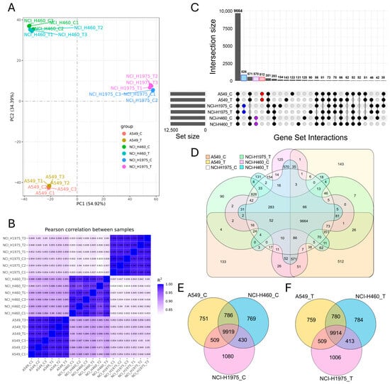 Global transcriptomic profiling of NSCLC cell lines exposed to biomass haze-derived PM2.5. (A) Principal component analysis (PCA) reveals clear segregation of A549, NCI-H1975, and NCI-H460 transcriptomes, with separation between control (C) and PM2.5-treated (T) groups within each line. (B) Pearson correlation heatmap confirms high intra-group reproducibility (R2 ≥ 0.95) and highlights divergence between genotypes and treatment conditions. (C) UpSet plot and (D) six-way Venn diagram illustrate both the large conserved core transcriptome and condition-specific gene sets across all experimental groups. (E,F) Three-way Venn diagrams compare transcriptomes across A549, NCI-H1975, and NCI-H460 under control (E) and PM2.5 treatment (F), showing a stable shared core alongside cell line-specific expression signatures.