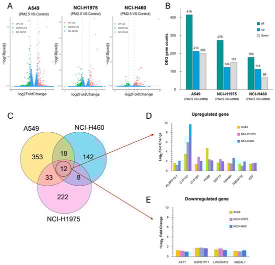 Differential gene expression profiles in NSCLC cell lines exposed to biomass haze-derived PM2.5. (A) Volcano plots showing significantly upregulated (green) and downregulated (red) genes for each cell line when comparing control and PM2.5 treatment (adjusted p ≤ 0.05, |log2FC| ≥ 1.0). (B) Bar chart summarizing the number of differentially expressed genes (DEGs) (green) of each cell line, separated into upregulated (blue) and downregulated (grey) genes. (C) Venn diagram illustrating the overlap of DEGs across the three cell lines. (D,E) Log2 fold changes for commonly upregulated genes (D) or downregulated (E) genes across cell lines, with colors indicating each cell identity.