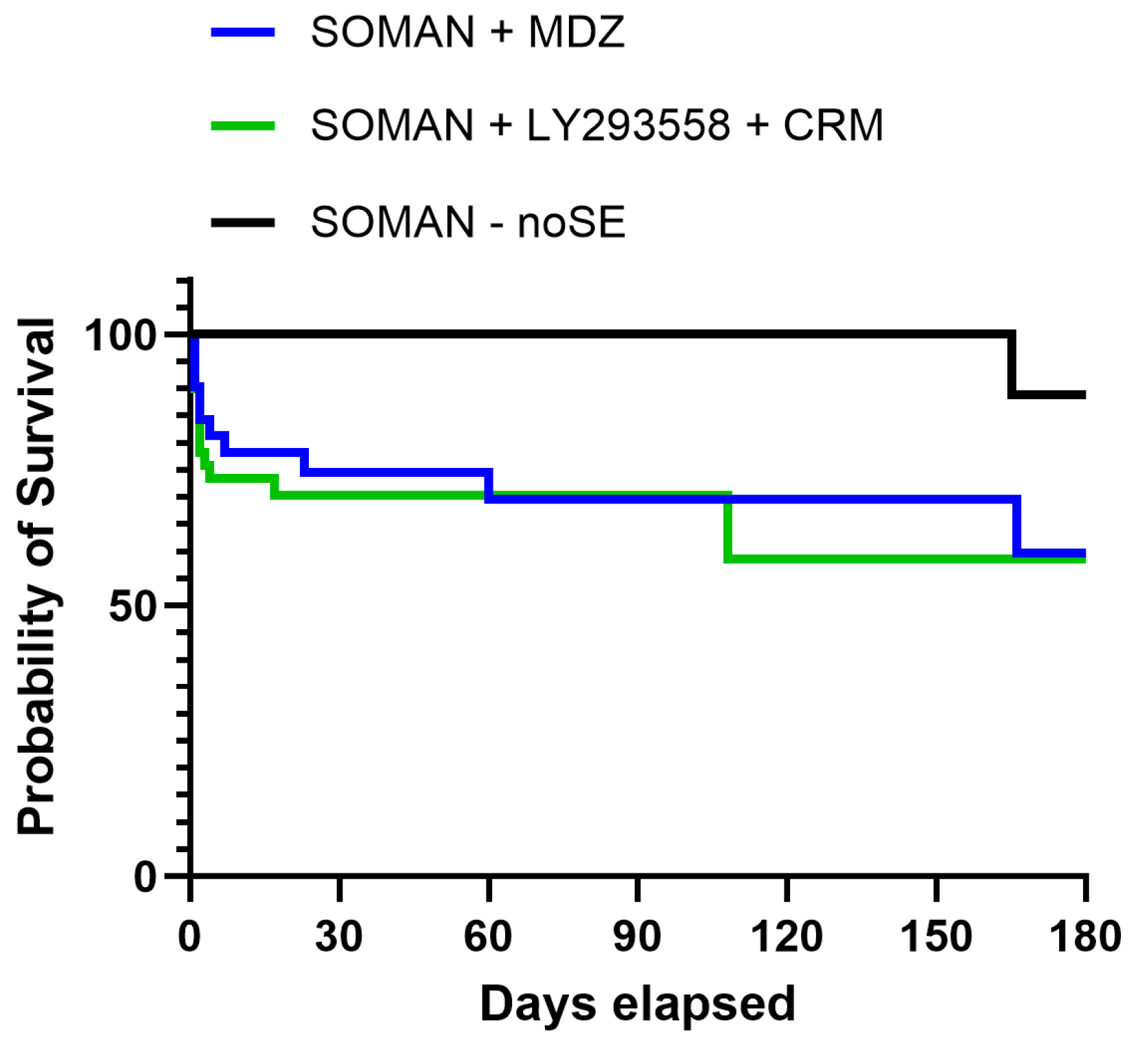 | Number of Aged Male Rats Exposed to Soman | Did Not Develop SE | Died Before Anticonvulsant Treatment | Received Anticonvulsant Treatment | 24 h Survival Rate |