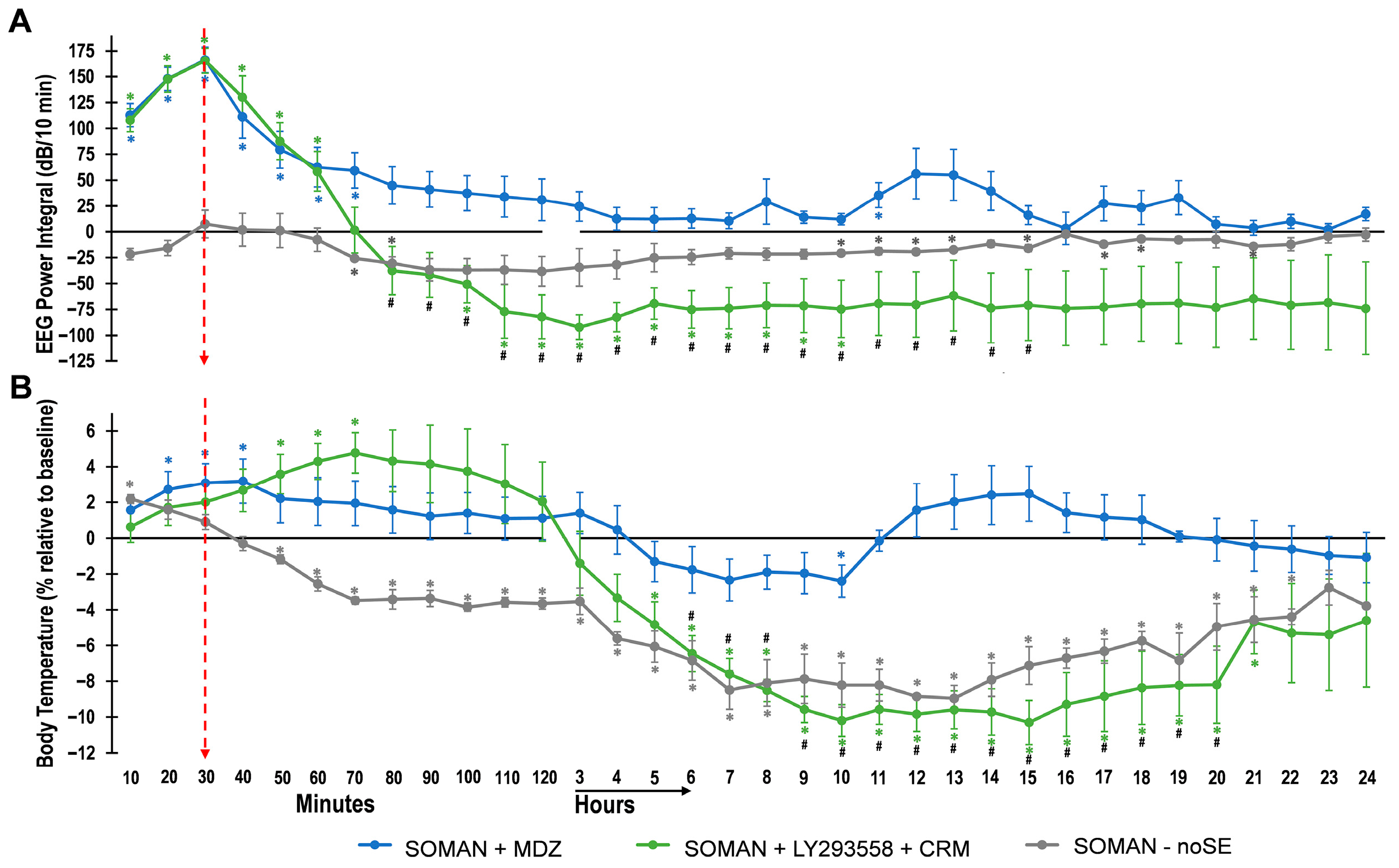 3.2. EEG Power Integral and Body Temperature over 24 h After Soman Exposure