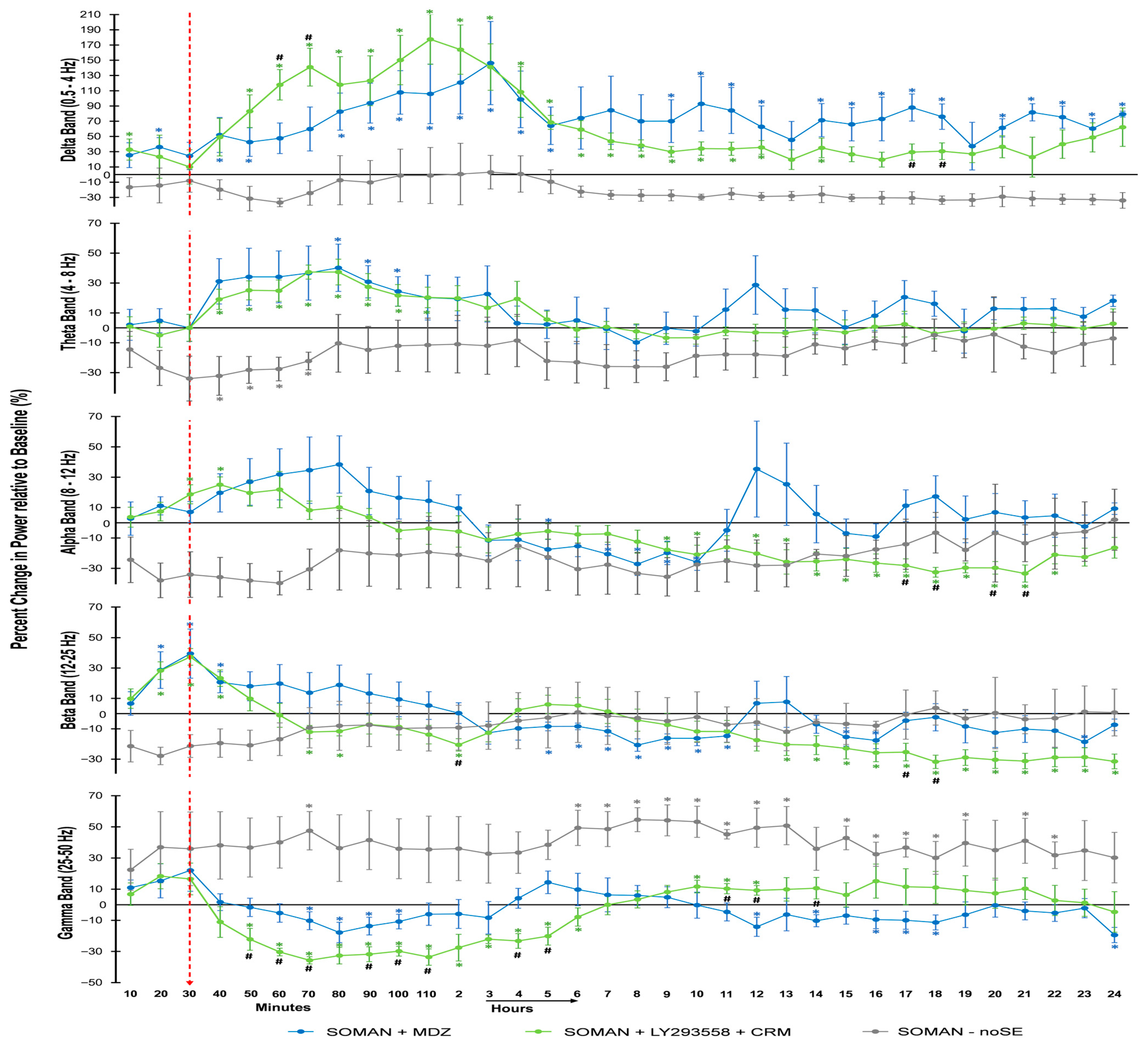- Carpentier, P.; Foquin, A.; Dorandeu, F.; Lallement, G. Delta activity as an early indicator for soman-induced brain damage: A review. Neurotoxicology 2001, 22, 299–315. [Google Scholar] [CrossRef]