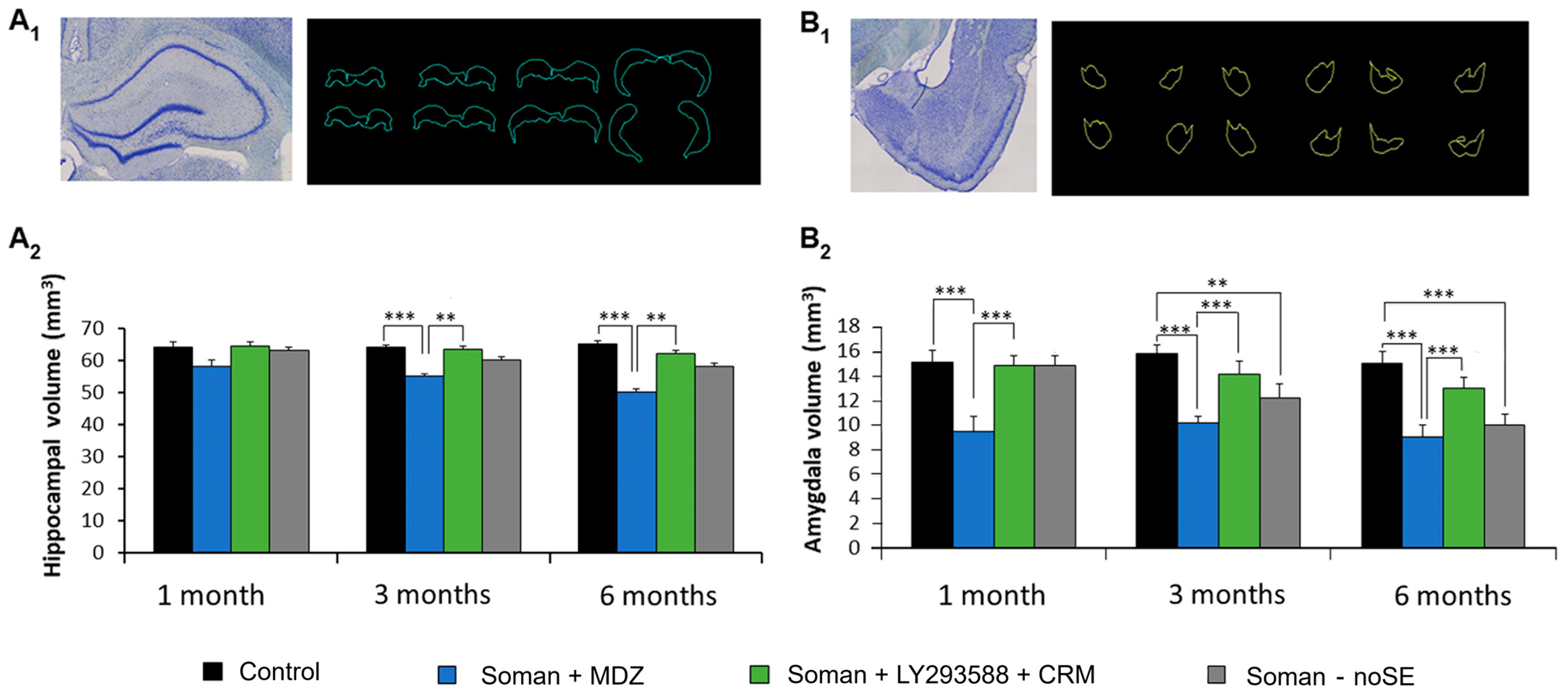- Apland, J.P.; Figueiredo, T.H.; Qashu, F.; Aroniadou-Anderjaska, V.; Souza, A.P.; Braga, M.F. Higher susceptibility of the ventral versus the dorsal hippocampus and the posteroventral versus anterodorsal amygdala to soman-induced neuropathology. Neurotoxicology 2010, 31, 485–492. [Google Scholar] [CrossRef]