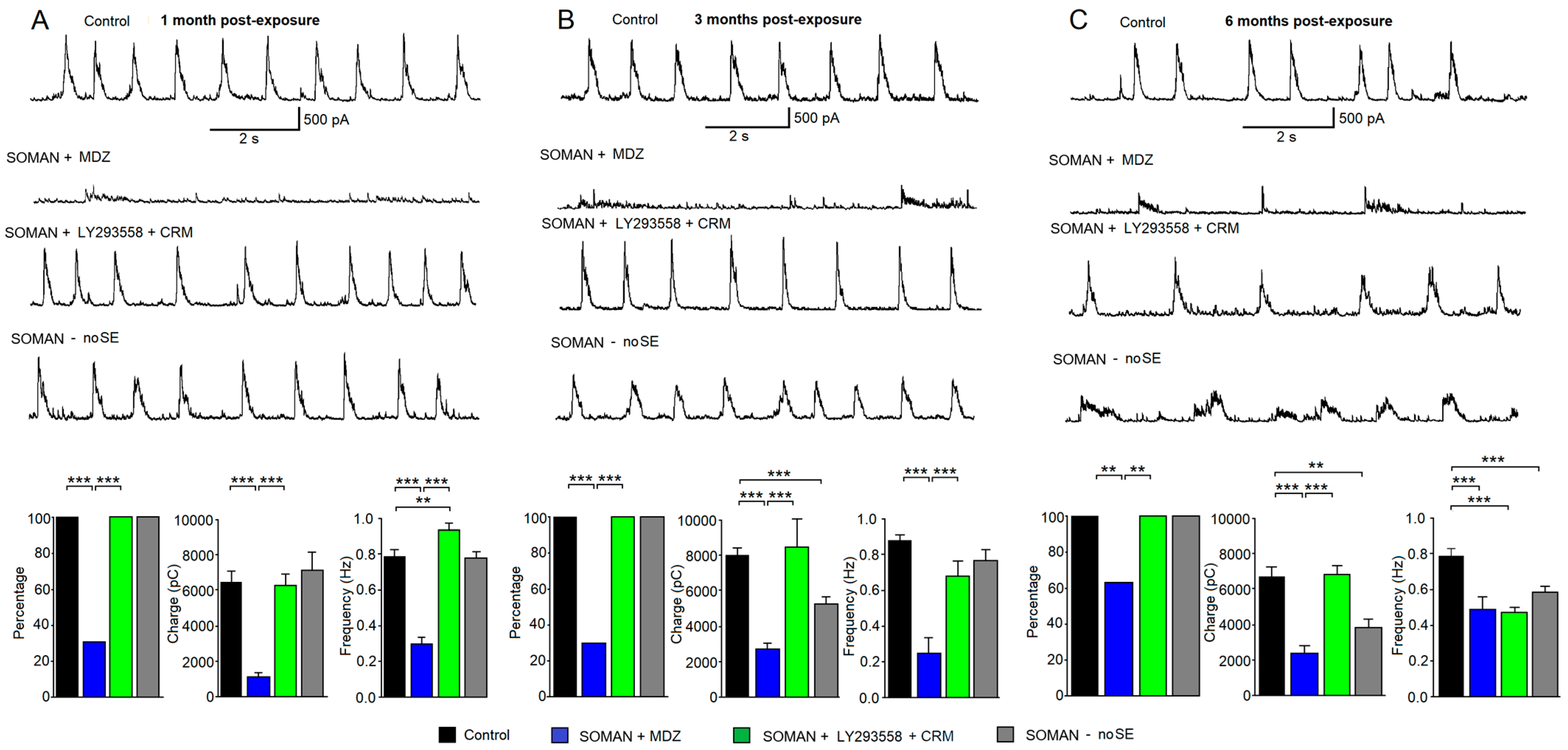 - de Araujo Furtado, M.; Aroniadou-Anderjaska, V.; Figueiredo, T.H.; Apland, J.P.; Braga, M.F.M. Electroencephalographic analysis in soman-exposed 21-day-old rats and the effects of midazolam or LY293558 with caramiphen. Ann. N. Y. Acad. Sci. 2020, 1479, 122–133. [Google Scholar] [CrossRef] [PubMed]