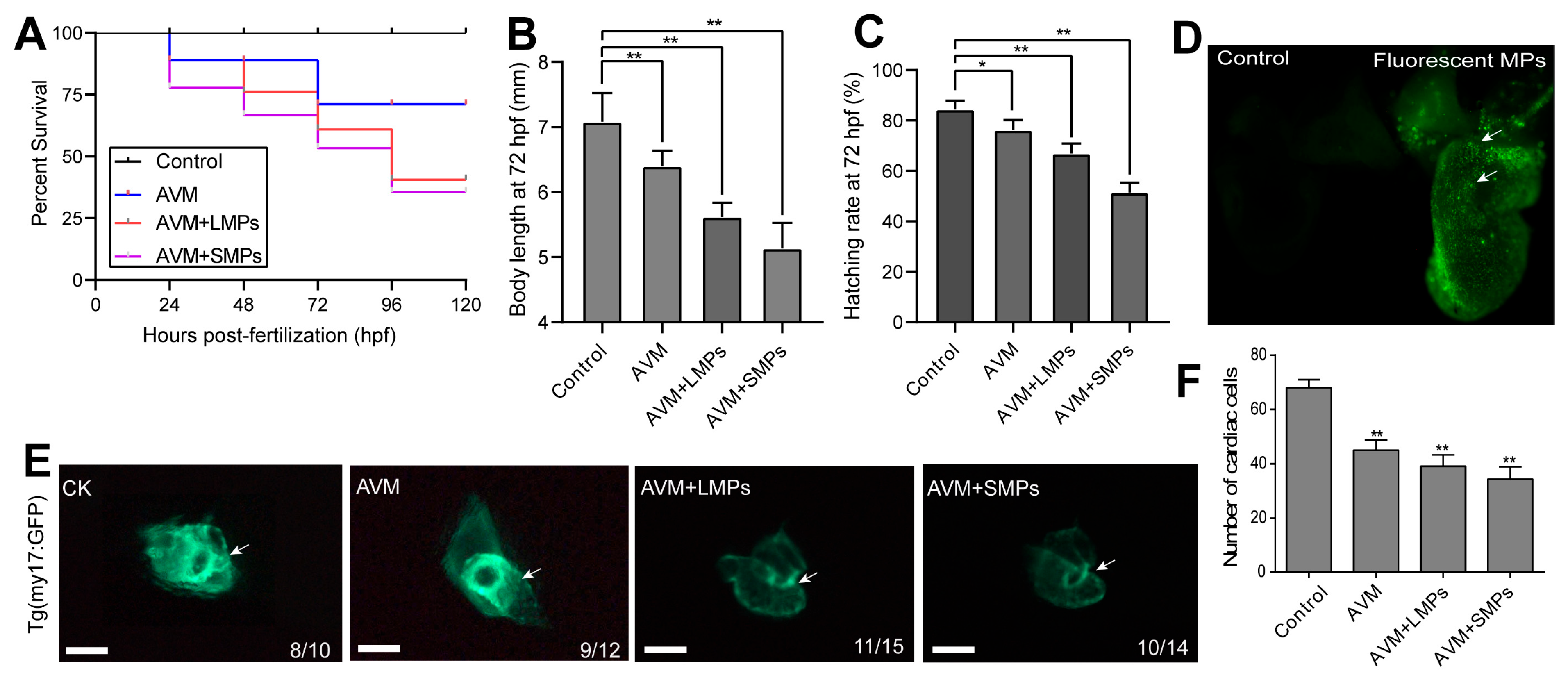 - PS-MPs and AVM co-exposure induced heart injury in larval and adult zebrafish.
