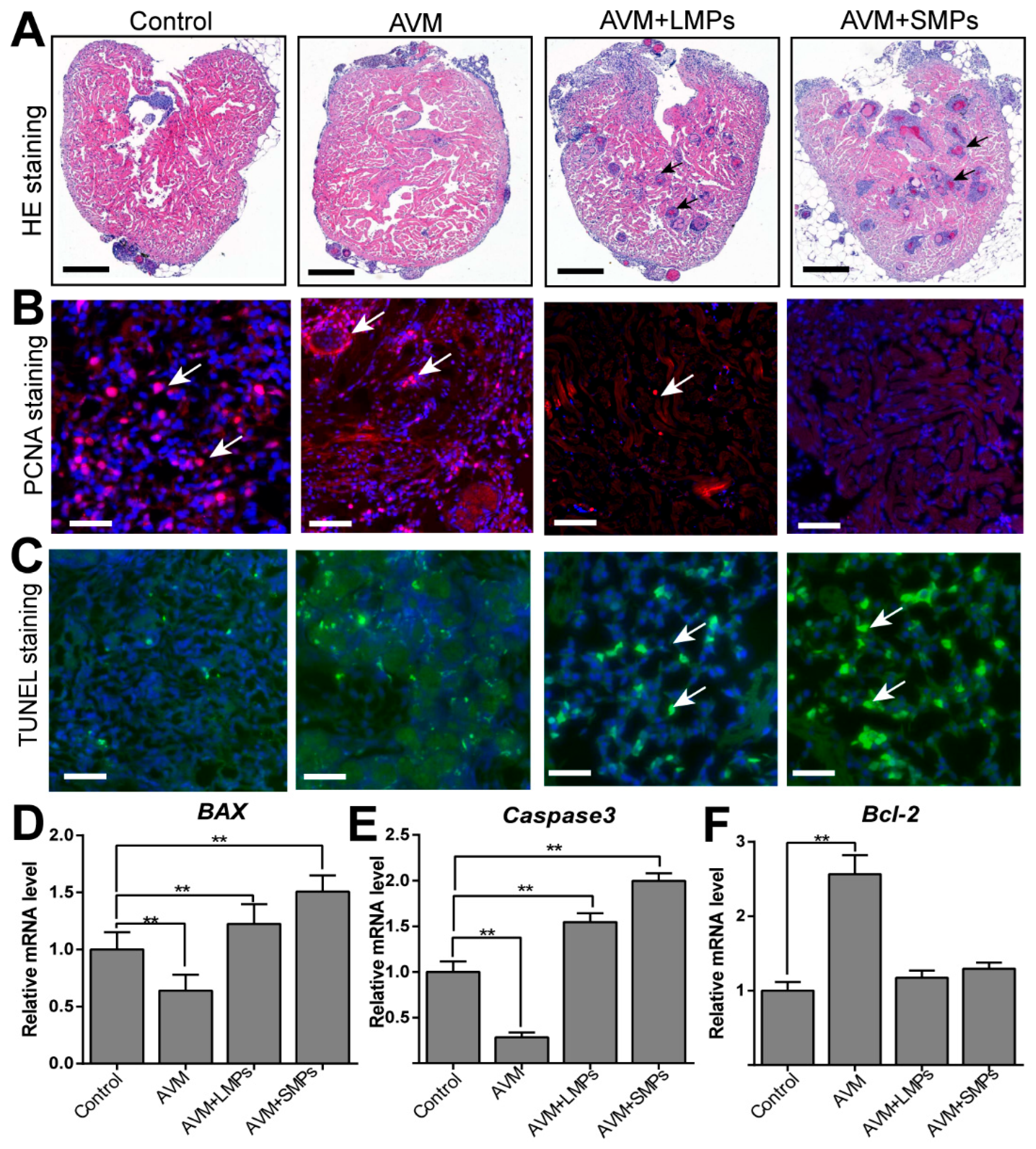 3.4. Intraperitoneal Injection of AVM and MPs Aggravated the Histopathology and Cardiomyocyte Apoptosis in Adult Zebrafish
