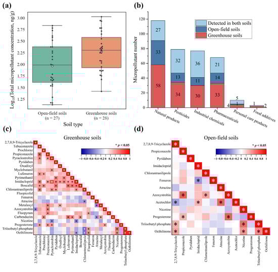 (a) Numbers of micropollutants by category, differentiated by detection in greenhouse soils, open-field soils, and both soils. (b) Comparison of log-transformed total micropollutant concentrations between greenhouse soils (n = 28) and open-field soils (n = 27). (c) Correlation among micropollutant concentrations in greenhouse soils. (d) Correlation among micropollutant concentrations in open-field soils.