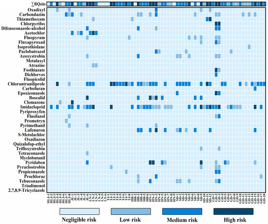 ΣRQsite represents the cumulative risk for a sampling site, calculated as the sum of individual RQi for all detected pesticides at that location. Cumulative risks were classified into four categories: negligible risk (ΣRQsite < 0.01), low risk (0.01 ≤ ΣRQsite < 0.1), moderate risk (0.1 ≤ ΣRQsite < 1), and high risk (ΣRQsite ≥ 1) [27].