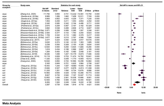 At this point, the meta-analysis method is an effective tool for bringing together quantitative data obtained from different studies and revealing general trends [38]. The increasing data accumulation in the nanotoxicology literature in recent years makes the applicability of this method possible [39]. In addition, there is still limited data in terms of ecosystem representation in the field of nano-ecotoxicology, and meta-analysis allows for evaluating this gap in a structured way [40].