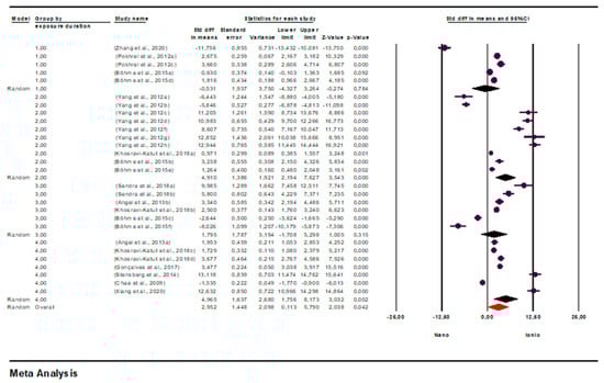 Another potential factor contributing to heterogeneity, exposure time, was also evaluated. For the toxicity tests, exposure time was divided into four range groups (1: 0–23 h, 2: 24–47 h, 3: 48–71 h, 4: 72+ h), and a subgroup analysis was conducted to assess its impact on heterogeneity.