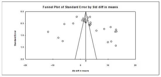 The Kendall’s Tau coefficient, calculated according to the Begg and Mazumdar rank correlation statistics, was 0.25132, and the two-tailed p-value was 0.06054. This value, above the statistical significance level of 0.05, indicates that there was no significant finding indicating publication bias among the studies evaluated in the meta-analysis [50]. Thus, it is understood that there was no systematic bias in the data included in the study due to the reporting of the results, which supports the reliability of the findings. Furthermore, the assessment of publication bias in meta-analyses is not limited to statistical tests; the use of visual tools is also important. To this end, a funnel plot was prepared in the study and presented in Figure 5. The funnel plot contributes to a more transparent assessment of publication bias by showing the distribution of effect sizes according to sample sizes.