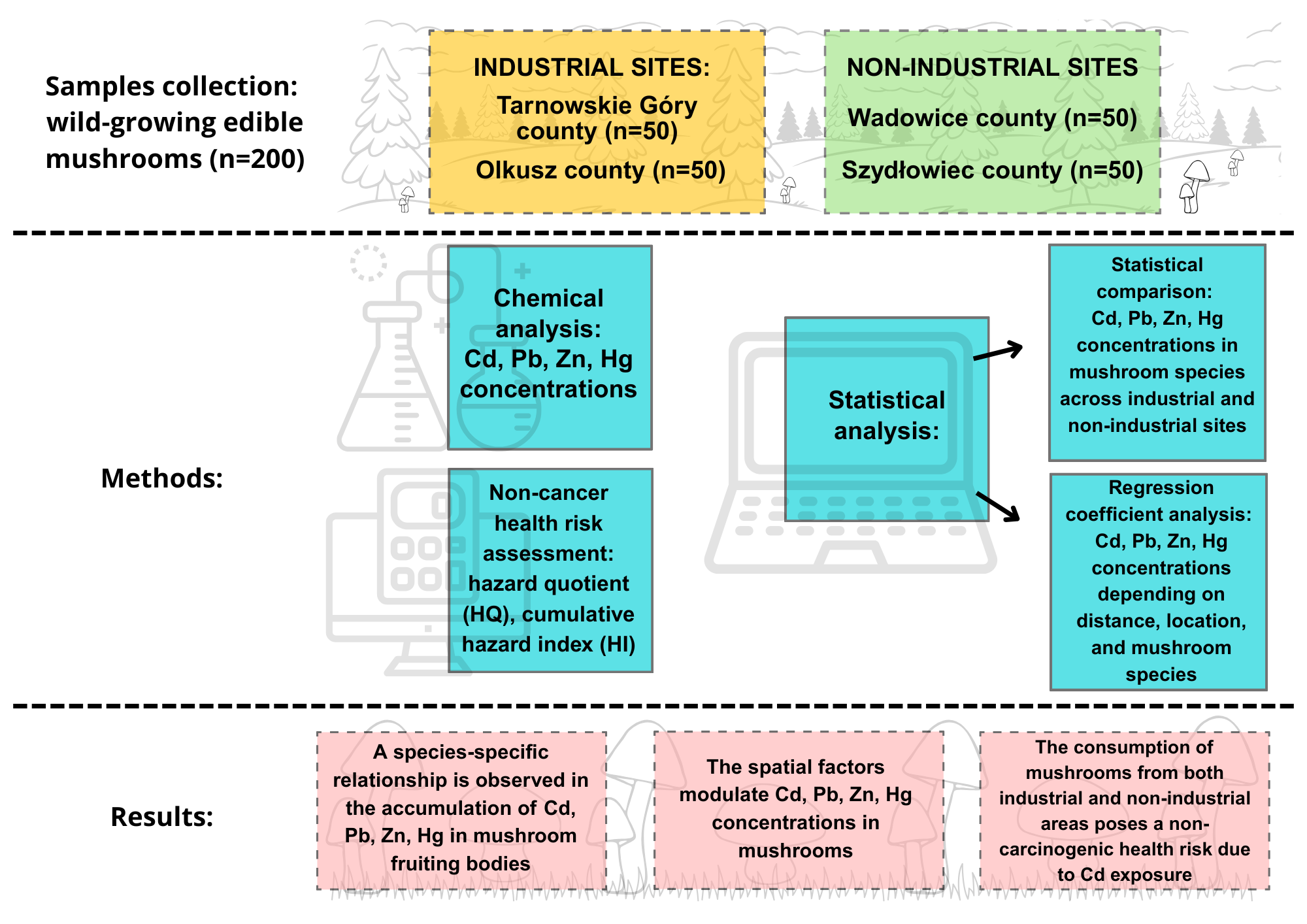 - Pająk, M.; Gąsiorek, M.; Jasik, M.; Halecki, W.; Otremba, K.; Pietrzykowski, M. Risk assessment of potential food-chain threats from edible wild mushrooms collected in forest ecosystems with heavy-metal pollution in Upper Silesia, Poland. Forests 2020, 11, 1240. [Google Scholar] [CrossRef]