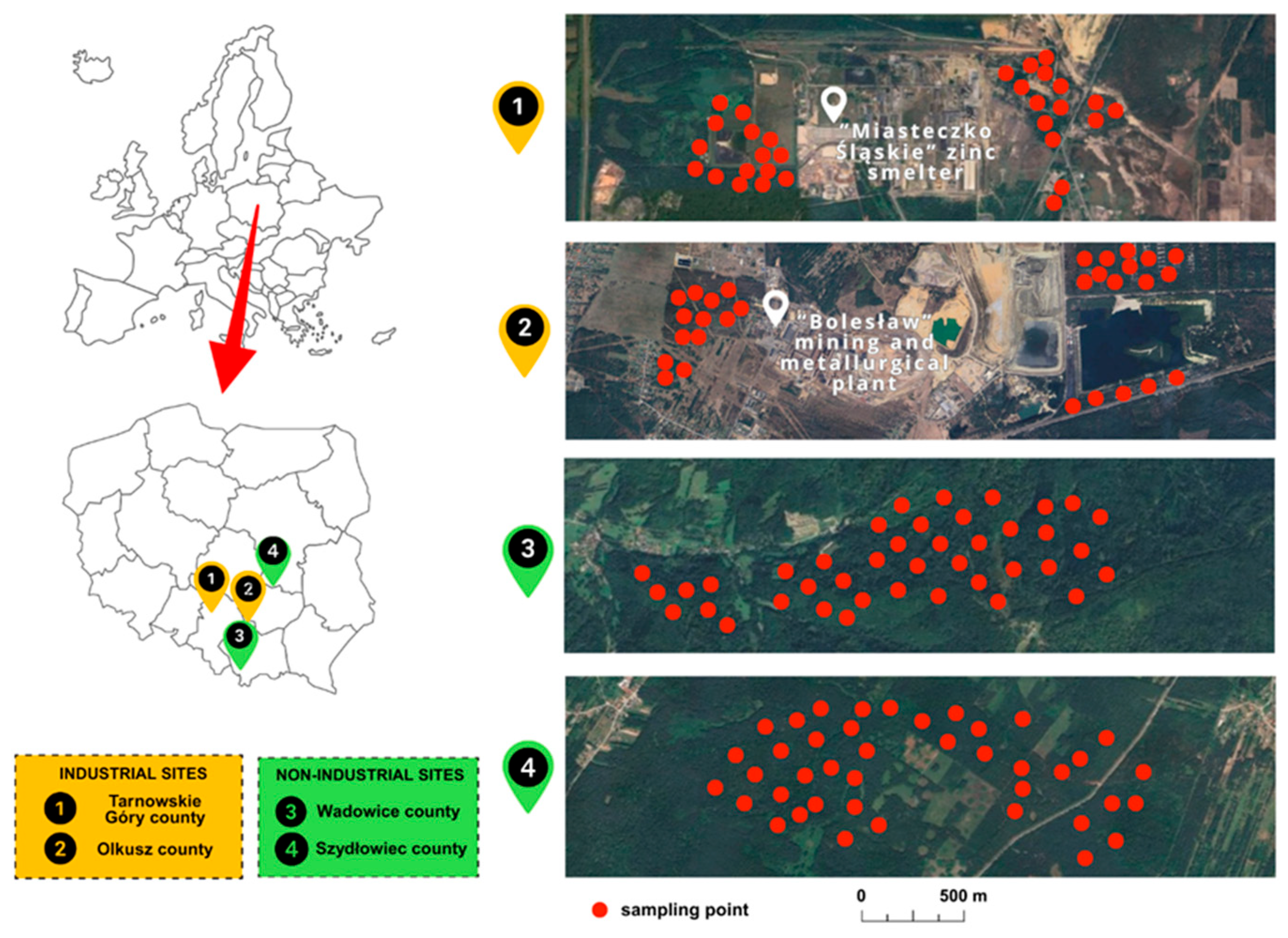 - Miśkowiec, P.; Łaptaś, A.; Zięba, K. Soil pollution with heavy metals in industrial and agricultural areas: A case study of Olkusz District. J. Elem. 2015, 20, 353–362. [Google Scholar] [CrossRef]