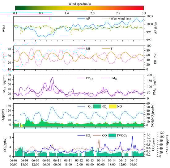 The time series analysis of trace gases, PM2.5, and meteorological parameters recorded at the Bozhou University site during the period from 8 to 16 June 2023.