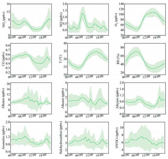 Average diurnal variation patterns of trace gases, meteorological parameters, and VOC components at the Bozhou University site from 8 to 16 June 2023 (green shading represents the standard deviation of the mean).