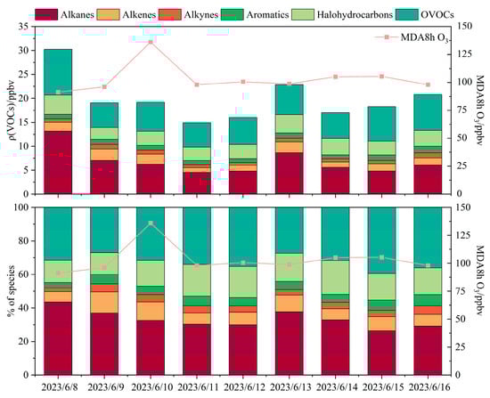 Analysis of total VOCs (TVOCs) during the O3 pollution episode revealed that alkanes were the predominant group, with the highest daily average concentration (6.8 ppbv) and relative contribution (33.3%), followed by oxygenated volatile organic compounds (OVOCs), halogenated hydrocarbons, and alkenes (Figure 3). The daily average concentration and proportion of alkanes peaked on 8 June and subsequently showed a fluctuating decline. Alkynes and aromatic hydrocarbons exhibited a steady upward trajectory over the course of the episode, peaking on 16 June with daily mean concentrations of 1.1 ppbv (5.1%) and 1.4 ppbv (6.7%), respectively. Further diagnostic analysis showed an ethylene/ethane ratio of 0.5 ± 0.4 in Bozhou, which was significantly lower (p < 0.01) than that reported for aged air masses in Hong Kong (0.7 ± 0.1) (Figure S3b). This finding suggests that the elevated O3 levels in Bozhou were partly influenced by aged air masses, likely attributable to regional pollutant transport and/or enhanced in situ atmospheric oxidation [45].