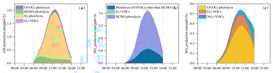 Average daytime primary production rates of (a) OH, (b) HO2, and (c) RO2 at the Bozhou University site during the O3 pollution period. (The O3 + VOCs contribution is too small to be visually apparent).