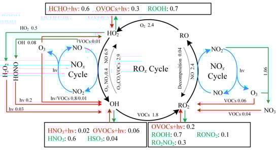 Diurnal average ROx budget from 06:00 to 18:00 LT during the O3 pollution period at the Bozhou University site. (The red, green, and black lines represent the production, consumption, and recycling pathways of radicals, respectively, in ppbv/h).