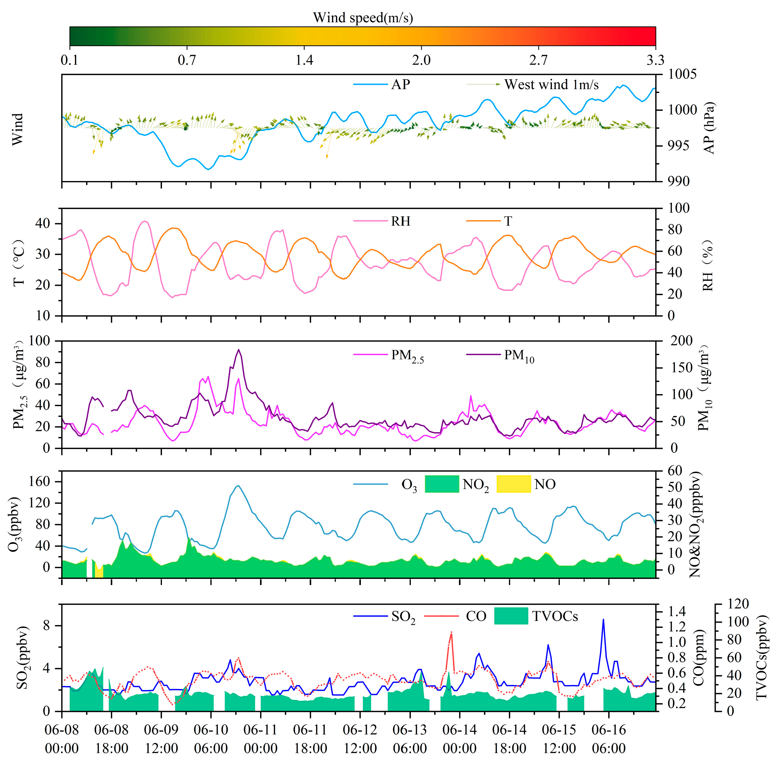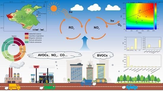 - Sun, X.Y.; Zhao, M.; Shen, H.Q.; Liu, Y.; Du, M.Y.; Zhang, W.J.; Xu, H.Y.; Fan, G.L.; Gong, H.L.; Li, Q.S.; et al. Ozone formation and key VOCs of a continuous summertime O3 pollution event in Ji’nan. Environ. Sci. 2022, 43, 686–695. [Google Scholar] [CrossRef]