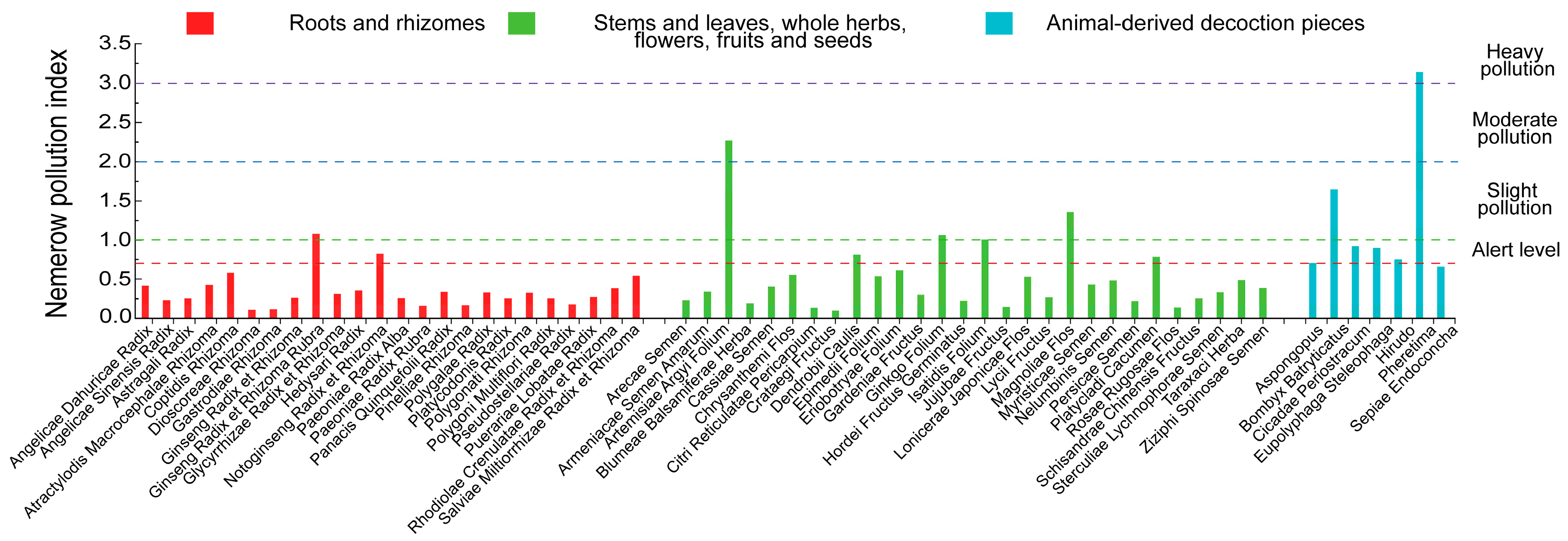 - Wang, Z.; Wang, H.; Wang, H.; Li, Q.; Li, Y. Heavy metal pollution and potential health risks of commercially available Chinese herbal medicines. Sci. Total Environ. 2019, 653, 748–757. [Google Scholar] [CrossRef]