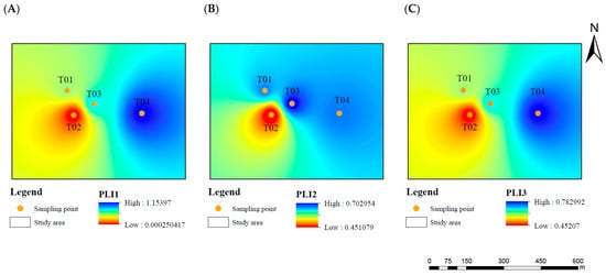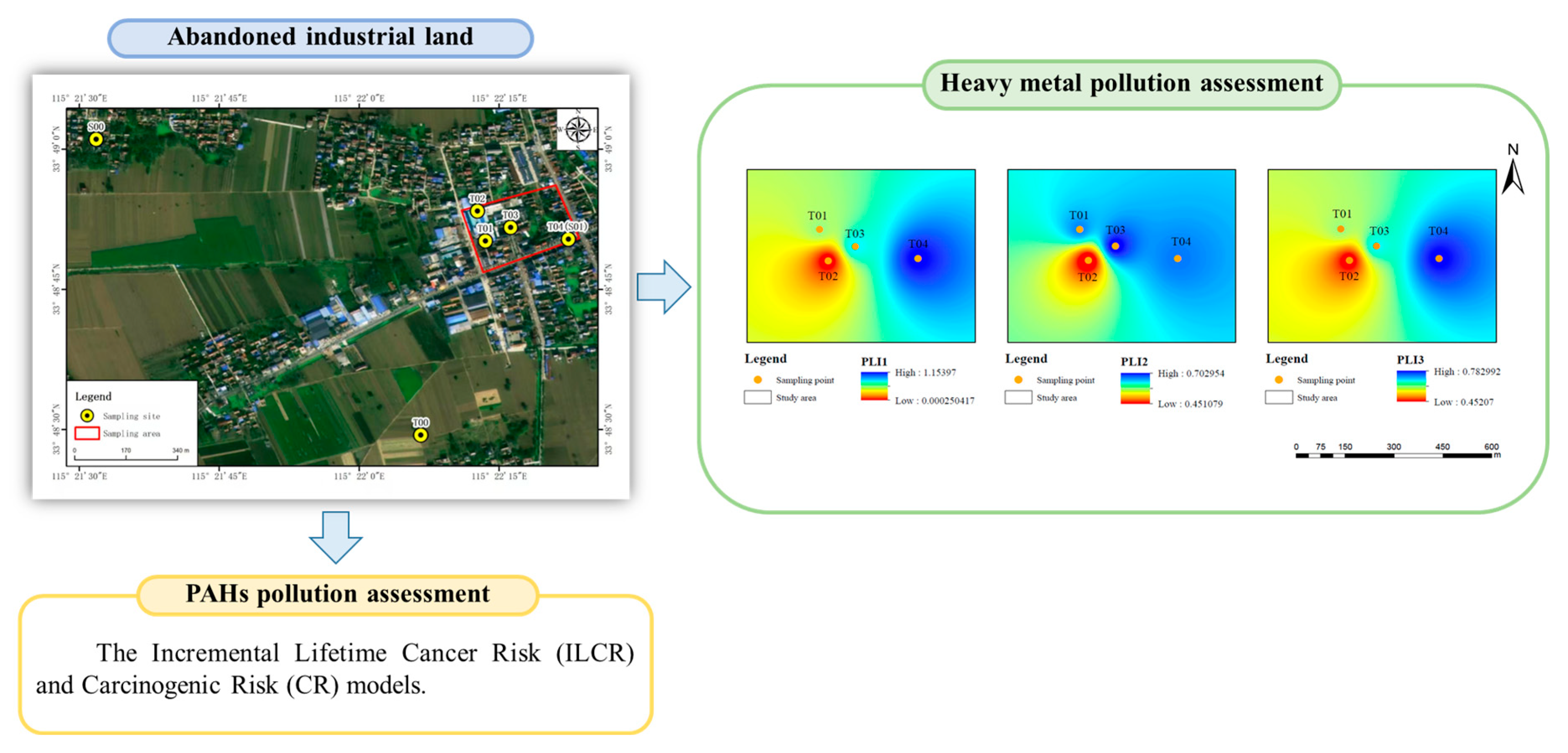 - The Incremental Lifetime Cancer Risk (ILCR) and Carcinogenic Risk (CR) models indicated that the carcinogenic risks of PAHs in the soil were within acceptable safety limits for both adults and children (CR < 10−4). However, the ILCR for children’s ingestion pathway slightly exceeded 10−6, suggesting that the health risk for children is slightly higher than for adults. Although the overall environmental quality of the abandoned industrial land meets the regulatory standards for land use, localized heavy metal contamination and the potential health risks of PAHs to children still warrant further monitoring and remediation efforts.