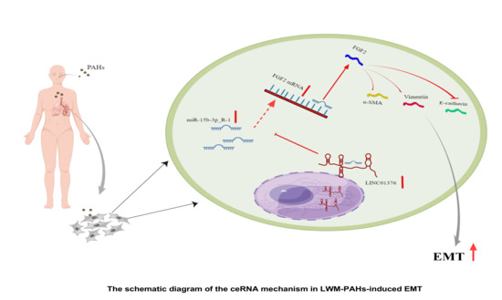 - Huang, Y.; Huang, Y.; Wang, H.; Zhang, H.; Shi, L.; Li, C.; Li, X.; Zeng, Y.; Liu, Y.; Wu, M.; et al. The effect of low molecular weight-polycyclic aromatic hydrocarbons responsive hsa_circ_0039929/hsa-miR-15b-3p_R-1/FGF2 circuit on inflammatory response of A549 cells via the PI3K/AKT pathway and epithelial-mesenchymal transition process. Environ. Toxicol. 2022, 37, 2005–2018. [Google Scholar] [CrossRef] [PubMed]