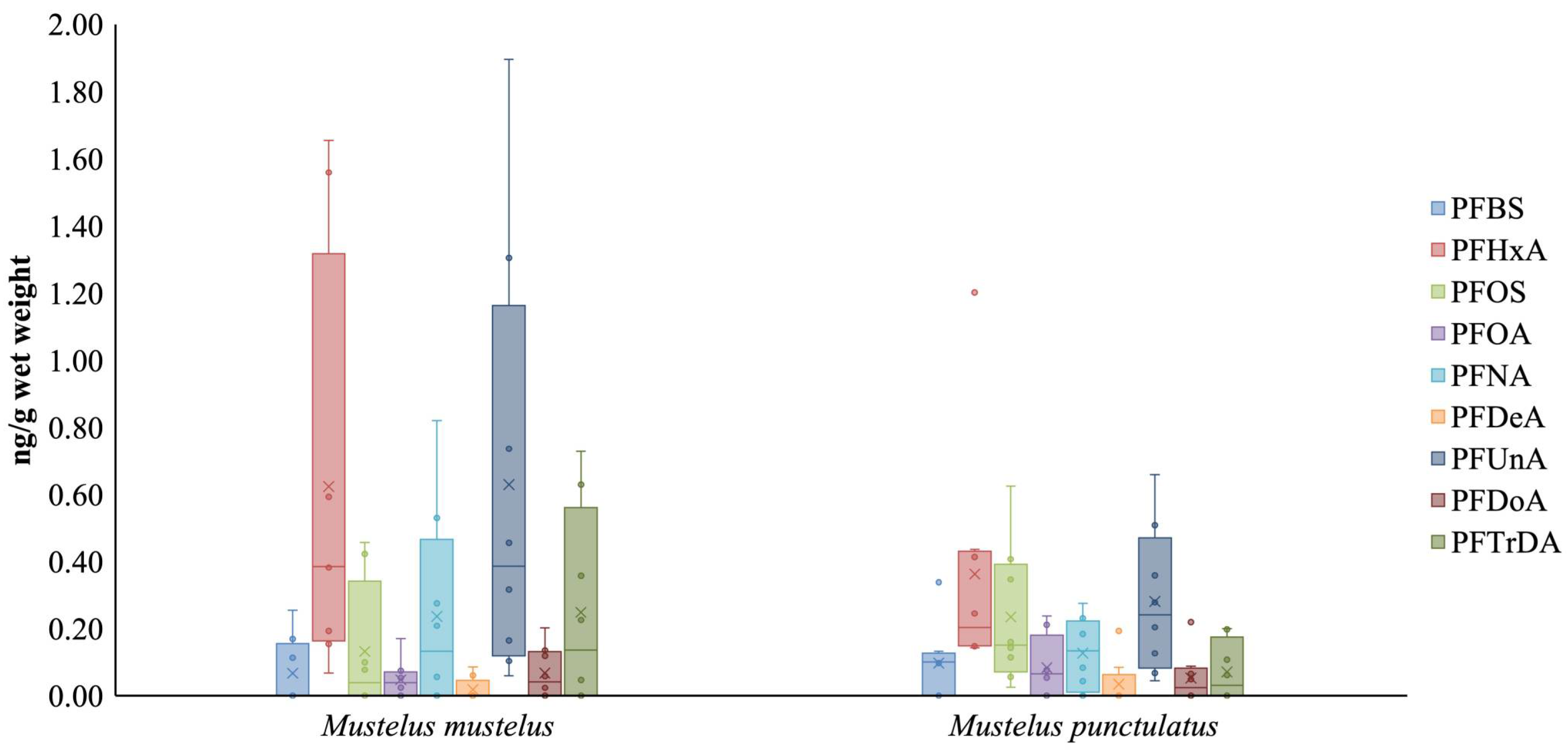 - Mehdi, Q.; Griffin, E.K.; Esplugas, J.; Gelsleichter, J.; Galloway, A.S.; Frazier, B.S.; Timshina, A.S.; Grubbs, R.D.; Correia, K.; Camacho, C.G.; et al. Species-Specific Profiles of per- and Polyfluoroalkyl Substances (PFAS) in Small Coastal Sharks along the South Atlantic Bight of the United States. Sci. Total Environ. 2024, 927, 171758. [Google Scholar] [CrossRef] [PubMed]