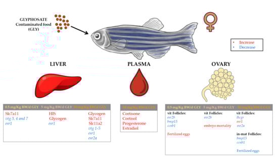 - Giommi, C.; Ladisa, C.; Carnevali, O.; Maradonna, F.; Habibi, H.R. Metabolomic and Transcript Analysis Revealed a Sex-Specific Effect of Glyphosate in Zebrafish Liver. Int. J. Mol. Sci. 2022, 23, 2724. [Google Scholar] [CrossRef]