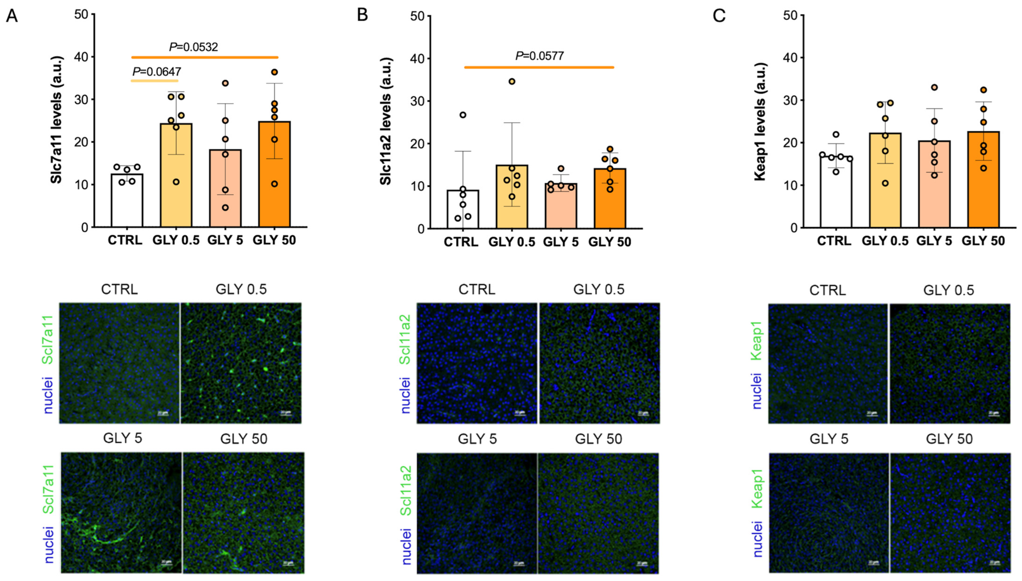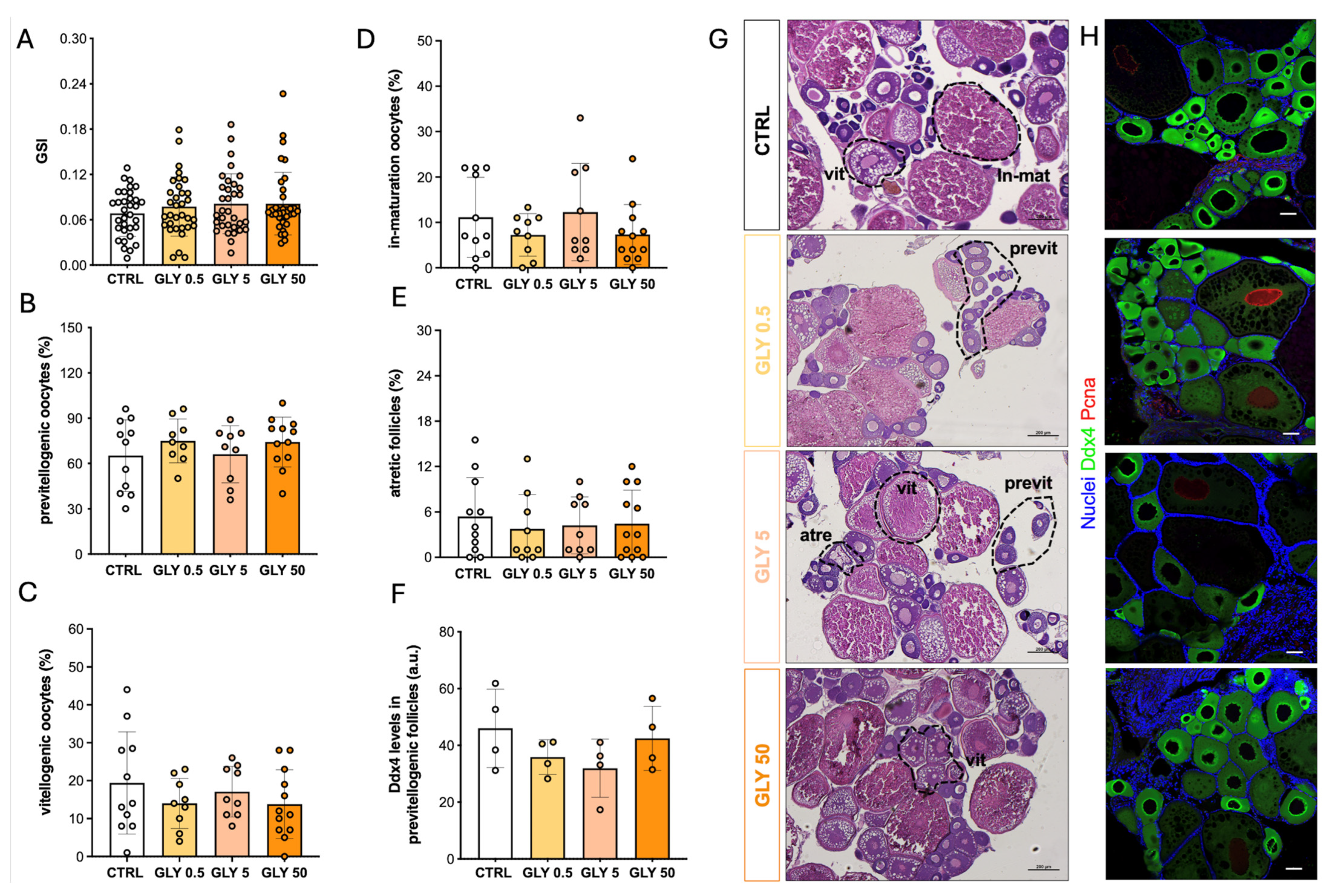 3.3. Impact of GLY on Gonadosomatic Index and Ovarian Histology and Immunohistochemistry