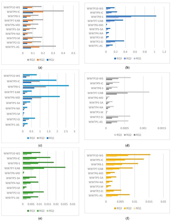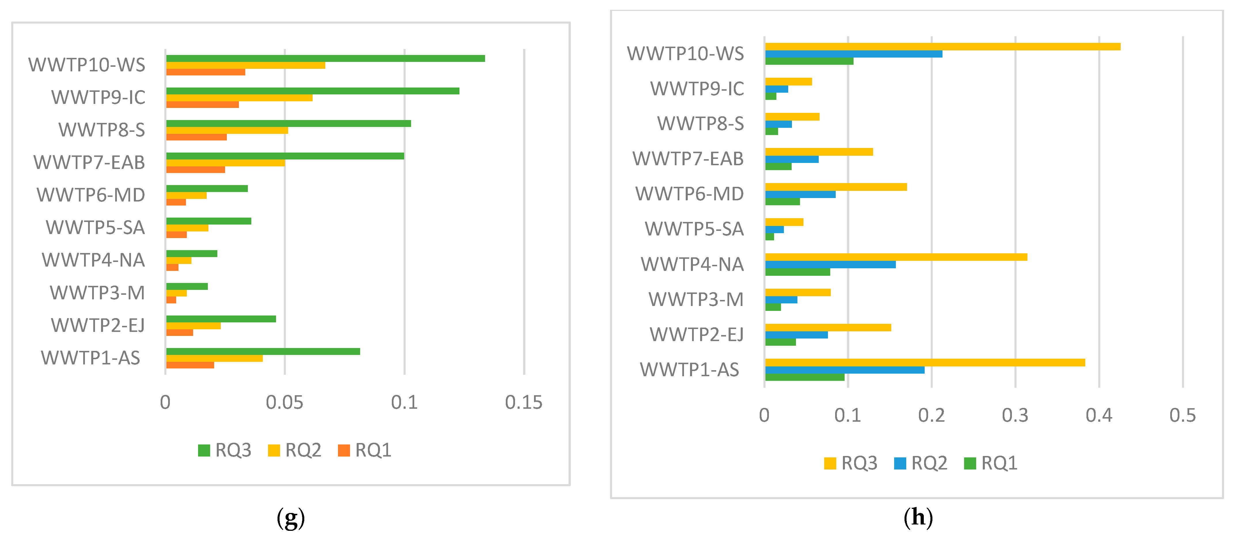 The remaining pollutants, ciprofloxacin and especially diclofenac, produced RQs above the value of 1 for WWTP6-MD, WWTP7-EAB, and WWTP8-S for some possible scenarios of fertilization (5–20 t/ha).