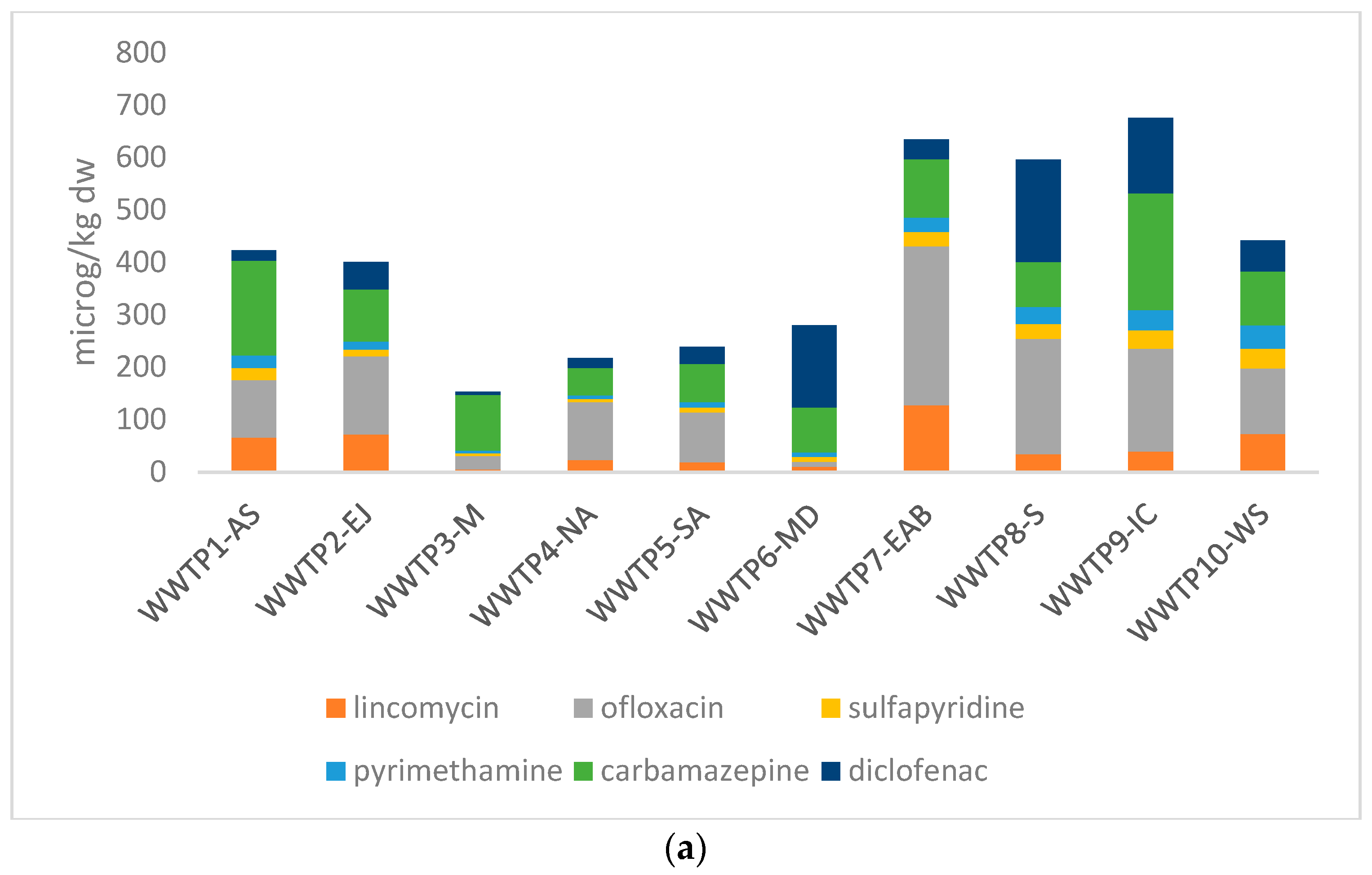 The sampling locations across the ten wastewater treatment plants (WWTPs) represented different sludge processing stages, including dewatering outlets, drying beds, filter presses, thickeners, and secondary clarifiers. These operational differences play an important role in determining the final concentration of pharmaceuticals detected in the sludge. Overall, the variation in pharmaceutical concentrations among WWTPs reflects the combined effects of sludge treatment stage, local climate, and industrial or domestic inputs. Samples from mechanically thickened or dewatered sludge generally show higher accumulation of persistent compounds, while open drying beds may exhibit lower values due to natural attenuation processes such as sunlight exposure, volatilization, and microbial degradation. This pattern highlights the significant role of socio-economic and industrial factors in determining the occurrence and magnitude of pharmaceutical contamination in wastewater and sludge, a trend consistent with findings from other developing regions [