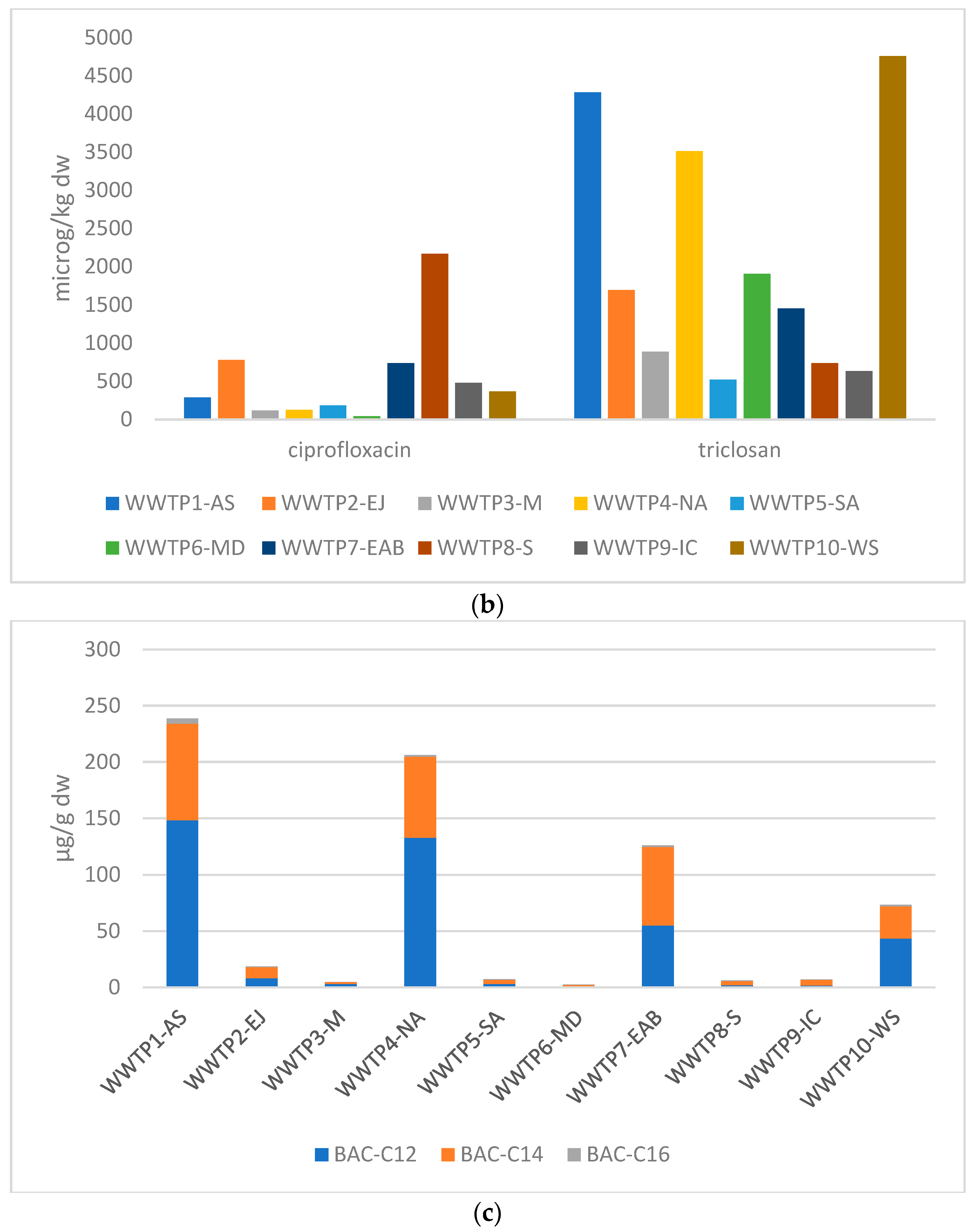 In parallel, quaternary ammonium compounds (QACs) are widely used in disinfectants, personal care products, fabric softeners, food-processing facilities, and healthcare institutions. Therefore, high concentrations of these compounds were detected in biosolids due to their strong cationic charge, which facilitates sorption onto negatively charged sludge particles, resulting in very low removal efficiencies through conventional treatment. QACs such as benzyldodecyldimethylammonium chloride (BAC-C12) and benzyldimethyltetradecylammonium chloride (BAC-C14) were the most abundant, with maximum concentrations of 148.4 µg g