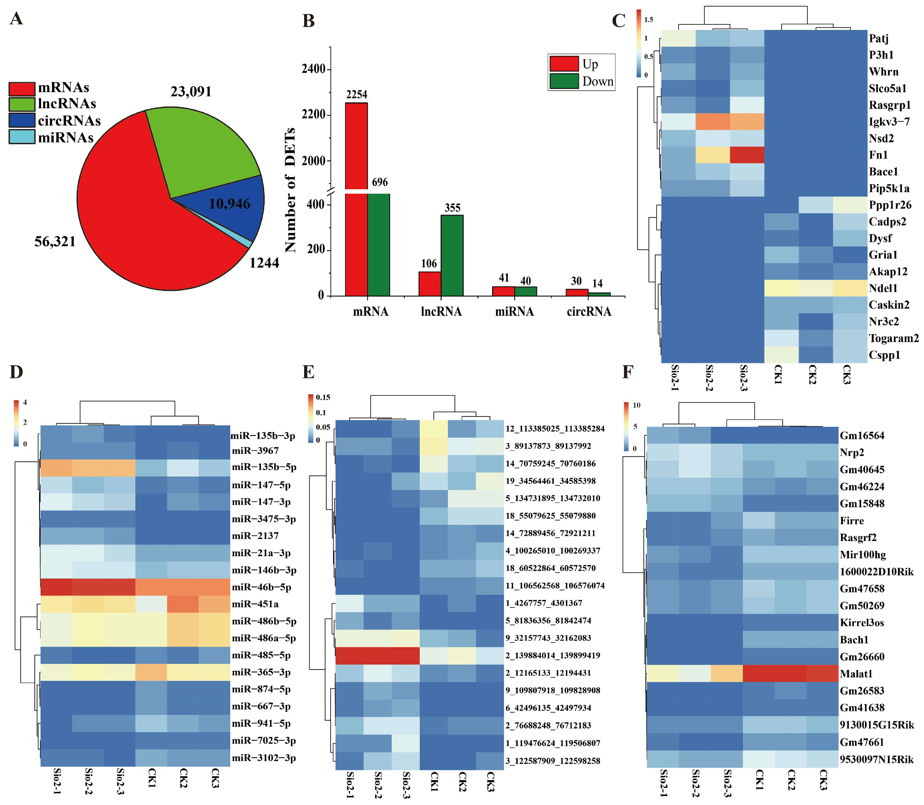 - Liu, T.; Su, X.; Kong, X.; Dong, H.; Wei, Y.; Wang, Y.; Wang, C. Whole transcriptome sequencing identifies key lncRNAs, circRNAs, and mRNAs for exploring the pathogenesis and therapeutic target of mouse pneumoconiosis. Gene 2024, 901, 148169. [Google Scholar] [PubMed]