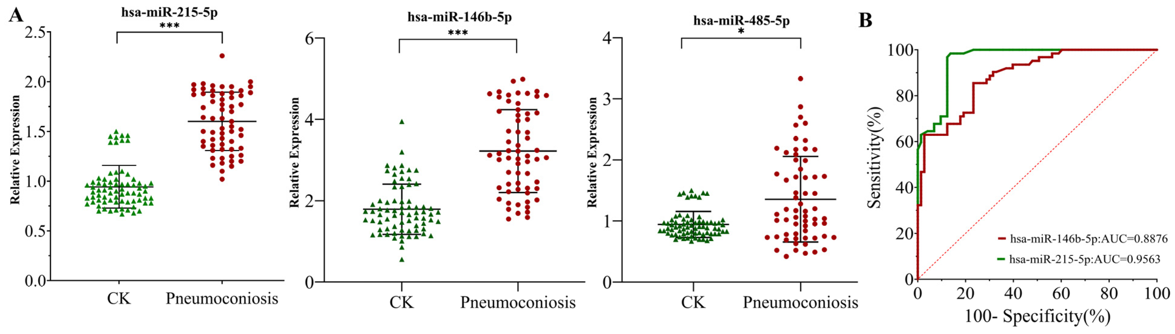 3.7. Expression Characteristics and Diagnostic Value of Candidate miRNAs in Pneumoconiosis
