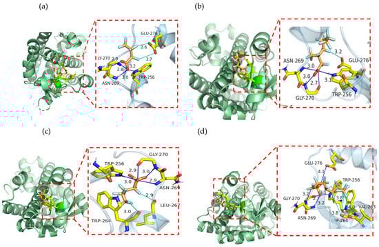 The docking results and binding data of representative PFAAs with PPARδ are shown in Figure 3 and Table 4. For PFBA (Figure 3a), the representative of perfluoroalkyl carboxylic acids (straight chain), the key amino acid residues involved in the interaction between PFBA and PPARα were TRP-256, ASN-269, GLY-270, and GLU-276, with the binding energy being −2.99 kcal·mol−1.