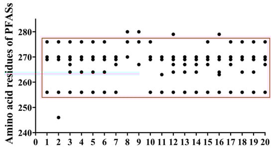 High-frequency amino acid distribution map: 1. PFBA; 2. PFHxA; 3. PFHpA; 4. PFNA; 5. PFDA; 6. PFUnDA; 7. PFDoDA; 8. PFTeDA; 9. PFHxDA; 10. 3m-PFOA; 11. 4m-PFOA; 12. 3,3m2-PFOA; 13. 4,4m2-PFOA; 14. PFBS; 15. PFHxS; 16. 1m-PFOS; 17. 2m-PFOS; 18. 3m-PFOS; 19. 4m-PFOS; 20. 5m-PFOS. (Black dot: amino acid residues; red frame: distribution region of high-frequency amino acid residues).