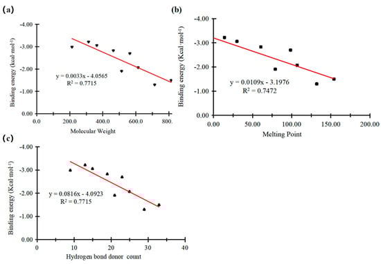 Correlation between binding energy of PFCAs with PPARδ and physicochemical properties of PFCAs: (a) molecular weight; (b) melting point; (c) number of hydrogen bond donors.