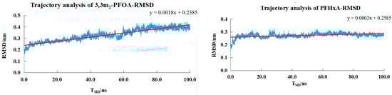 To verify the binding stability of the key complexes predicted by molecular docking and to investigate the dynamic behavior under solvation and protein flexibility, we conducted MD simulations on PFBA, PFOA, 3,3m2-PFOA, and PFHxA. Table 7 lists the molecular weights, molecular weight, presence of branched structures, and the fluctuation range of root-mean-square deviation (RMSD) for the four small molecules. The maximum root-mean-square deviation (RMSD) values for all systems were all less than 1, indicating that the docking conformations of all simulated systems were stable in the molecular dynamics simulation.