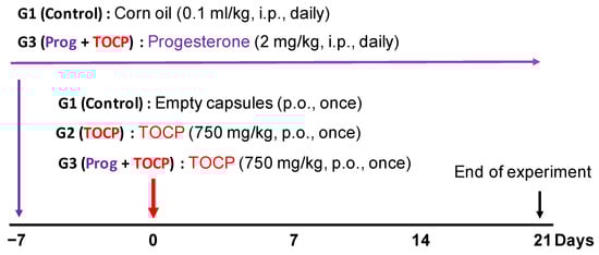 Adult Beijing white laying hens aged ten months with body weight 1.3–1.5 kg were obtained from Fujia Breeding Poultry Center (Beijing, China). After one week of acclimatization, the birds were housed in an air-conditioned (22 °C) room with a 12 h light–dark cycle. Food and water were allowed ad libitum. Hens with similar body weight were randomly assigned to three groups with six hens per group. Only empty capsules were given to the control group (group 1, G1) by oral gavage. TOCP (750 mg/kg body weight) was given to all other treatment groups (groups 2 and 3, G2 and G3) by oral gavage in gelatin capsules. The dose of TOCP treatment is selected according to earlier studies [21,23,24]. The hens in group 2 (G2) received TOCP (750 mg/kg body weight, p.o.) and corn oil (0.1 mL/kg body weight, i.p.). Seven days before the TOCP treatment, the hens in group 3 (G3) received daily administration of progesterone (2 mg/kg body weight) by intraperitoneal injection until the end of the study (i.e., until the 21st day after TOCP administration); the progesterone was dissolved in corn oil. The design of the animal experiment is shown in Figure 1. The toxicological signs of OPIDN were evaluated by an eight-point scale according to a previous report [25].