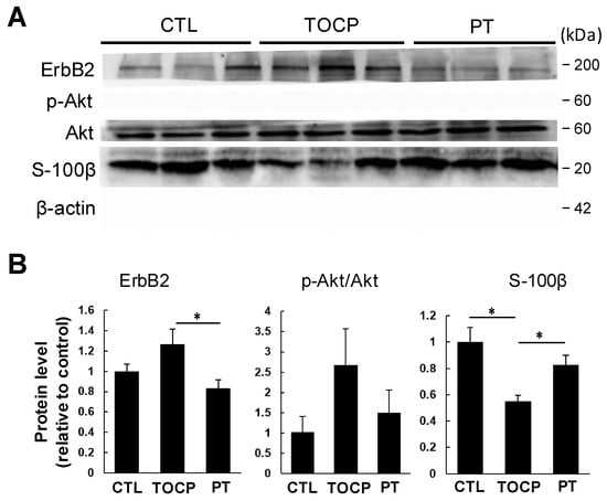 Effect of TOCP plus progesterone on expression of S-100β and ErbB2 signaling molecules in sciatic nerves of the hens. (A) Biochemical analysis of S-100β and ErbB signaling system by Western blotting analysis in hens’ sciatic nerves. The experiment was repeated three times. In each replicate, six samples from each group were loaded on the two gels of the same apparatus (each gel contained three samples from each group; all samples were run simultaneously). (B) Protein expression levels were quantified as gray values and normalized to β-actin, and the data are presented as mean ± SEM. “*” indicates significant difference between the two columns (p < 0.05, n = 3). Abbreviations: CTL, control; TOCP, tri-o-cresyl phosphate; PT, progesterone plus TOCP.