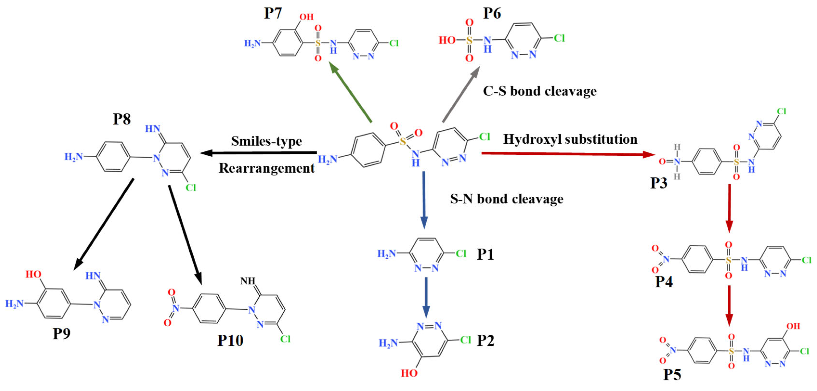 3.4. Identification of SCP Degradation Products with Proposed Degradation Pathways