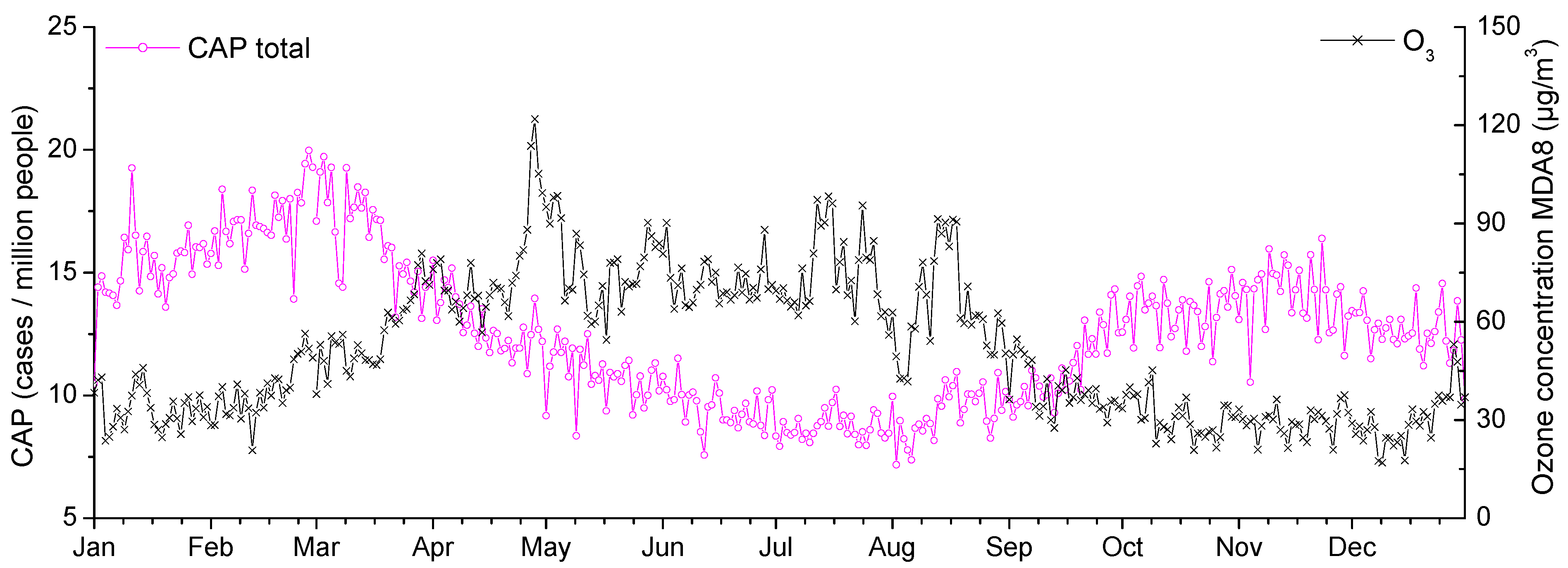 | Year | O3_MDA8, µg/m3 | tmax, °C | CAP, Cases/Millions Persons |