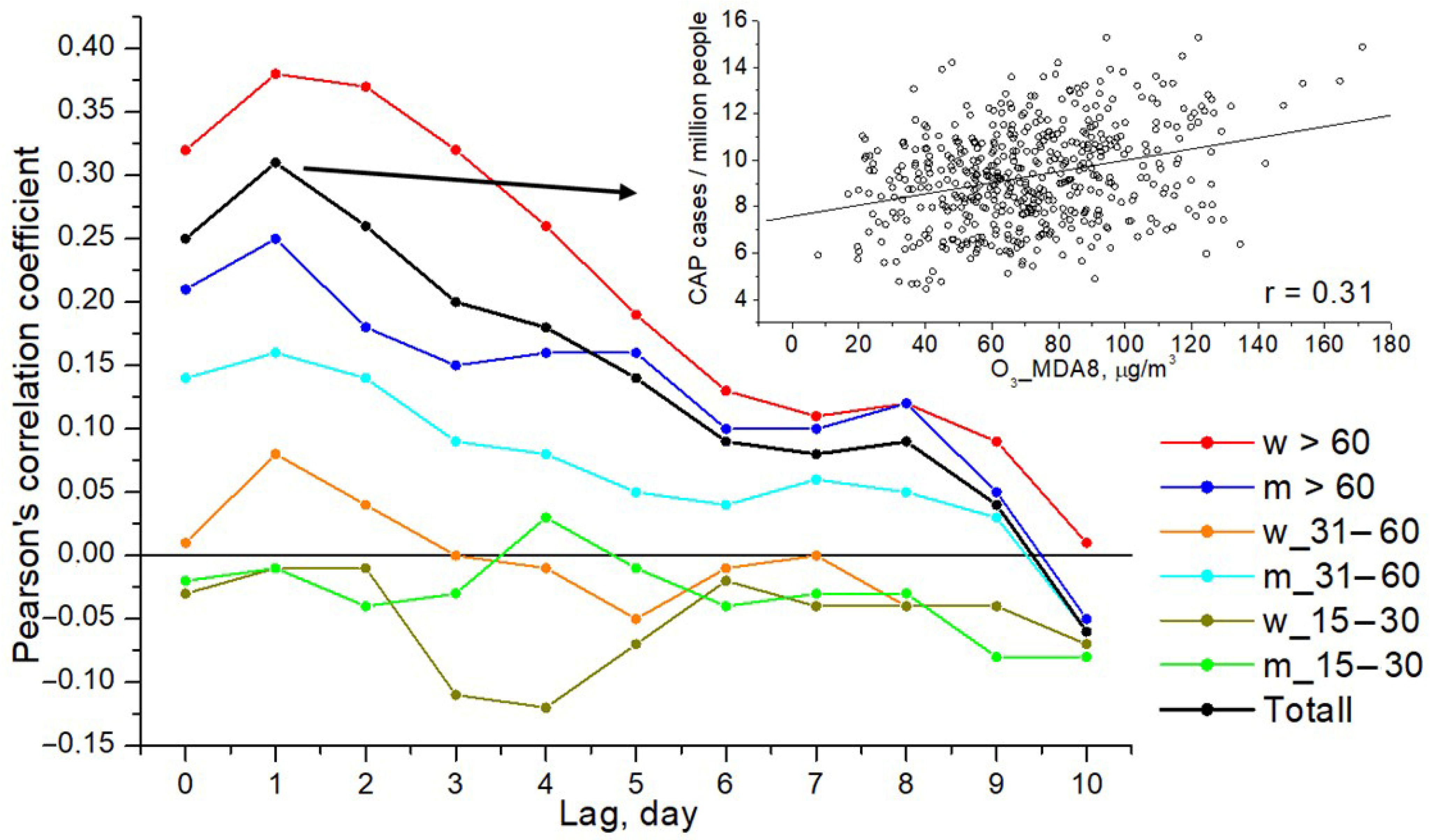 | Lag, Day | r (CAP, O3_MDA8) | r (CAP, tmax) |