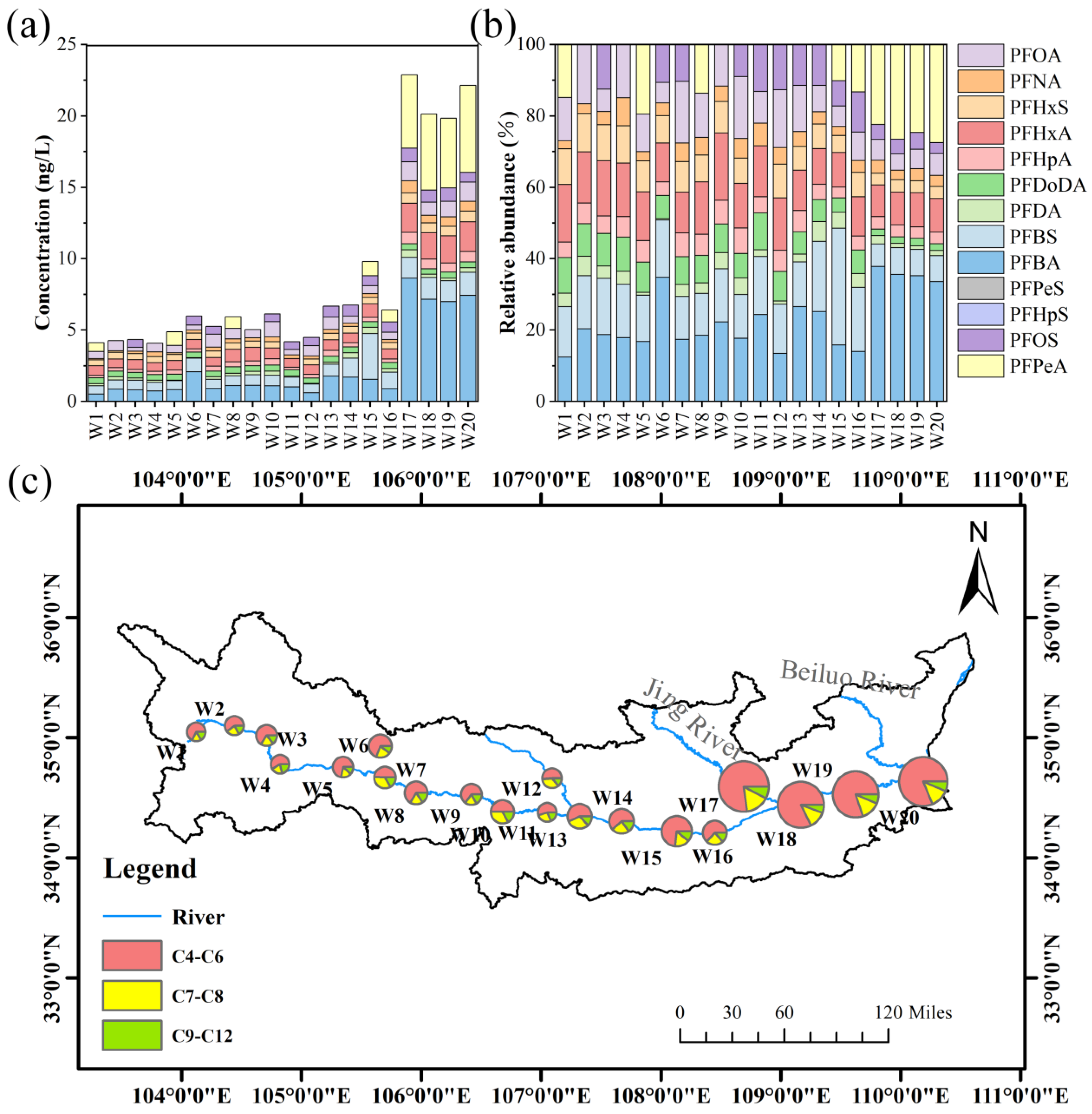 - Qiao, H.; Bai, P.; Gao, L. Pollution characteristics of per/polyfluoroalkyl substances in waters of Beiluo River and Qingjian River, Yellow River Basins. Environ. Chem. 2025, 44, 1666–1676. [Google Scholar] [CrossRef]