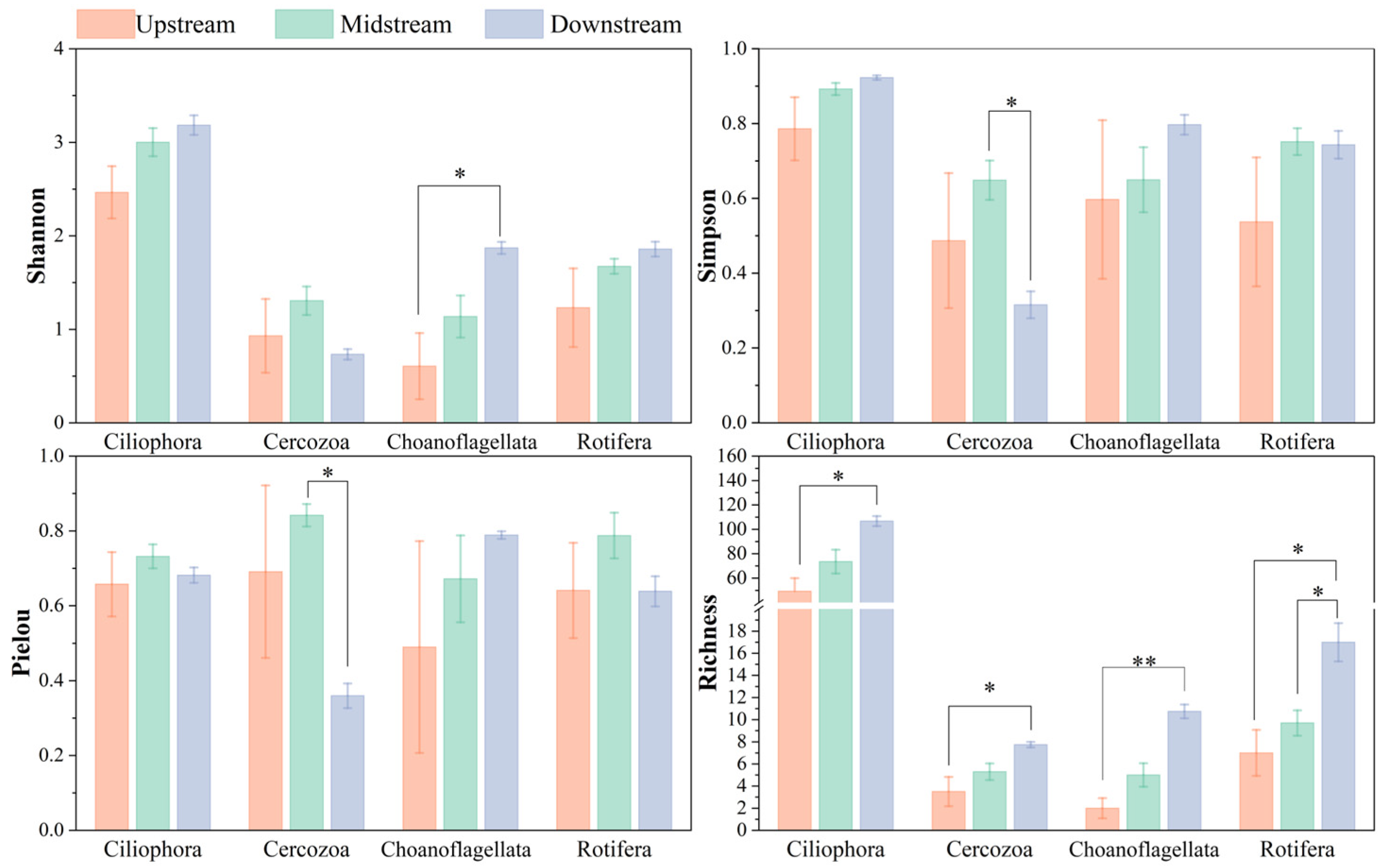 - Zhang, P.; Xiong, J.; Qiao, N.; An, R.; Da, Z.; Miao, W.; Ba, S. Spatiotemporal distribution of protists in the Yarlung Zangbo River, Tibetan Plateau. Water Biol. Secur. 2022, 1, 100064. [Google Scholar] [CrossRef]