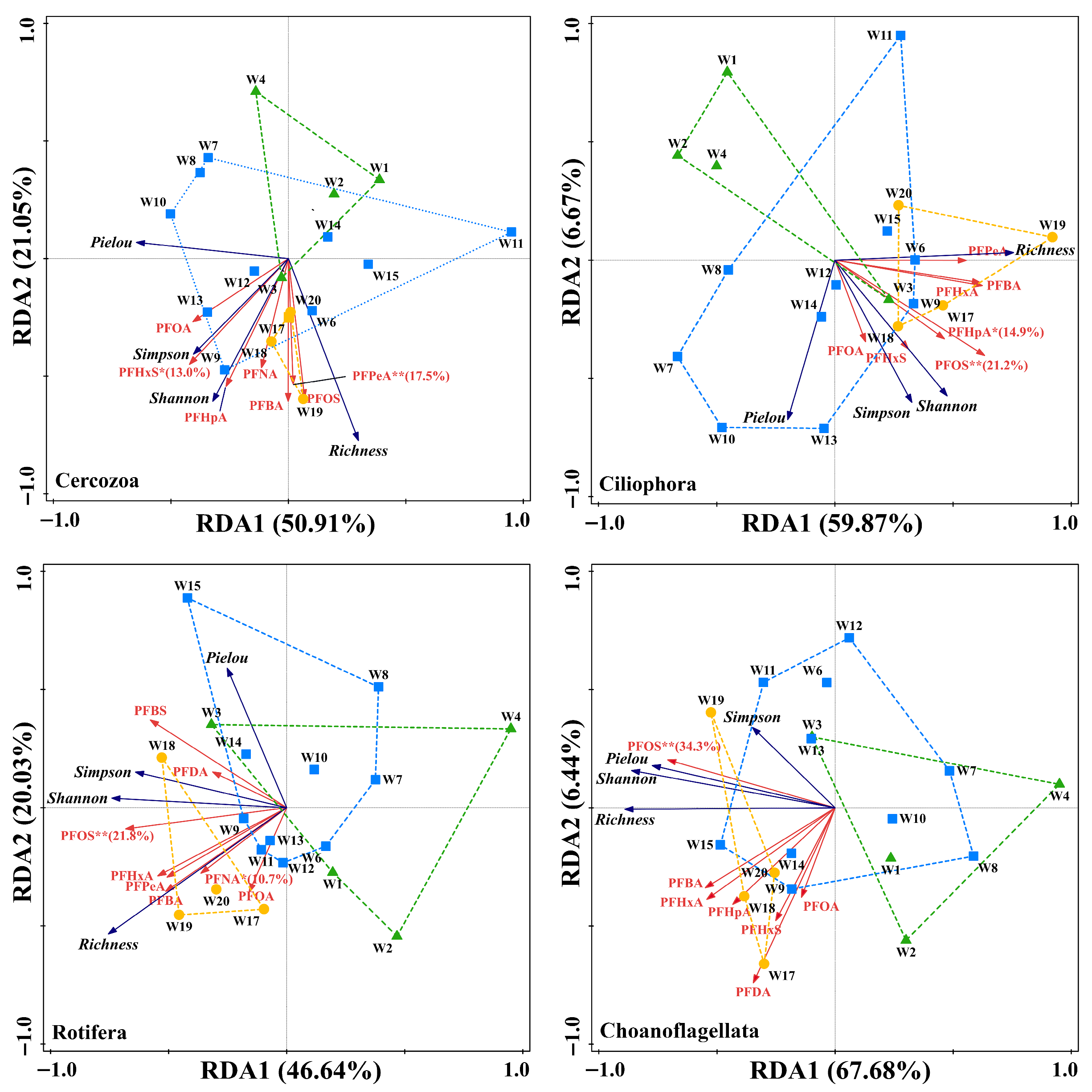 4.2. Response of Zooplankton Communities to PFAS Pollution