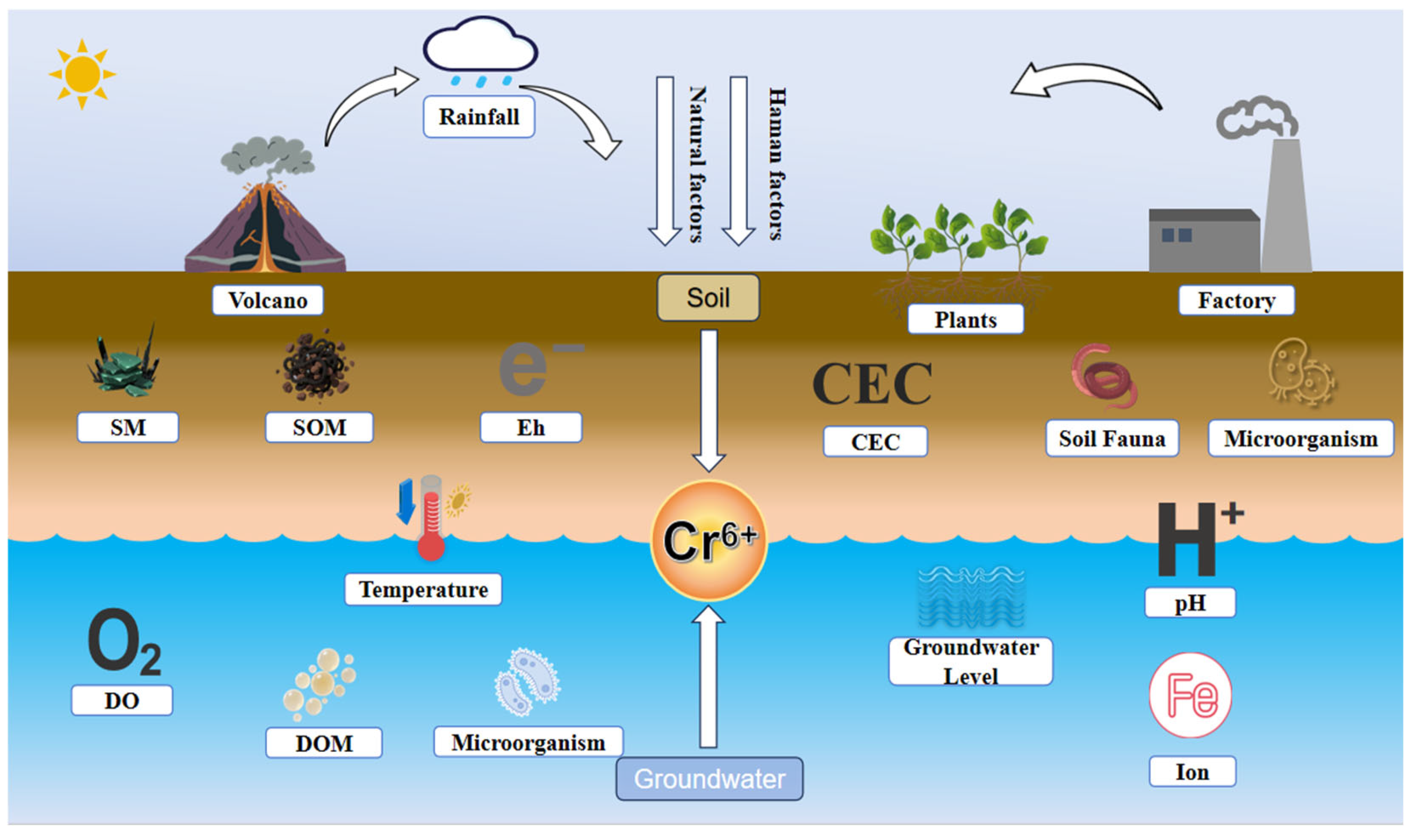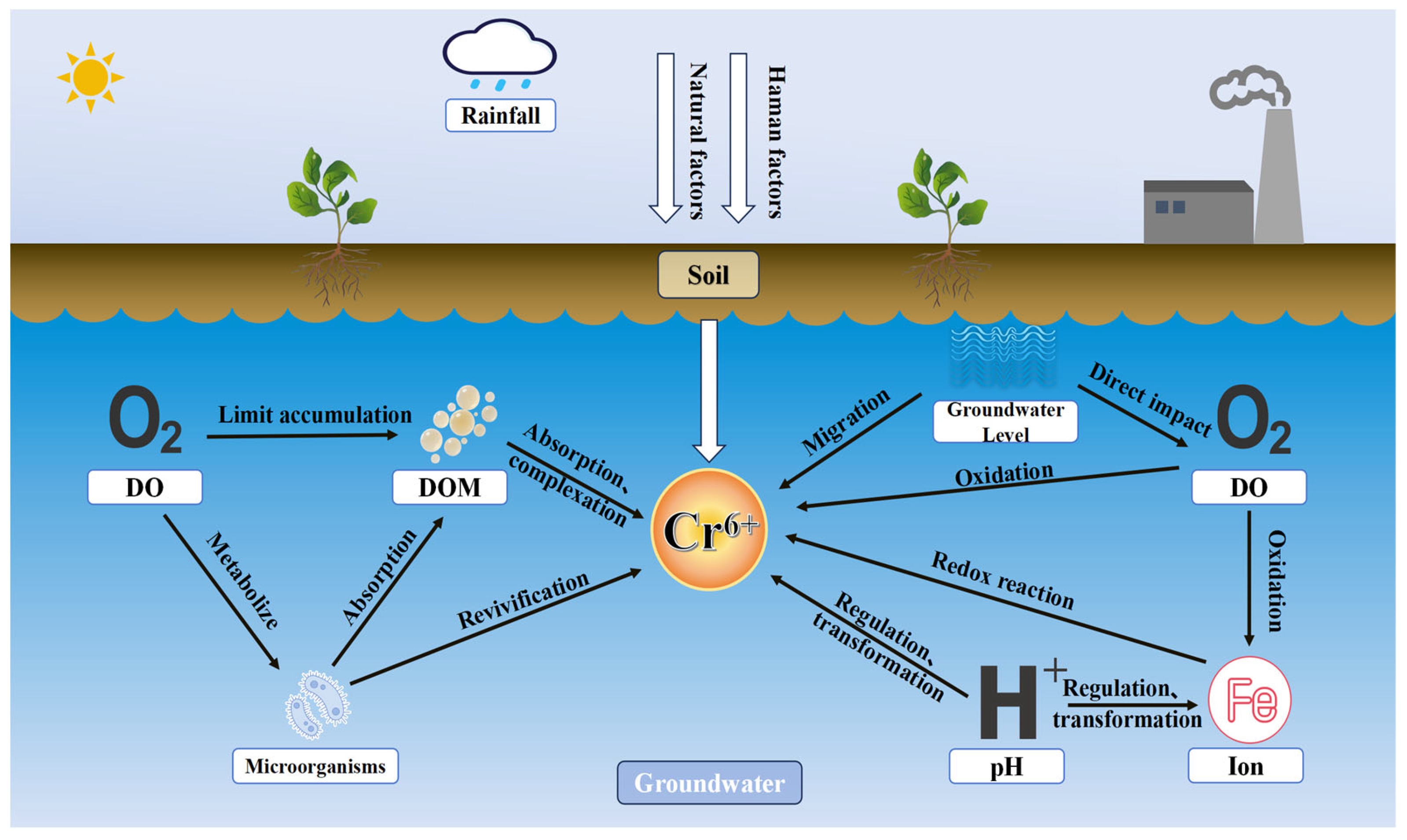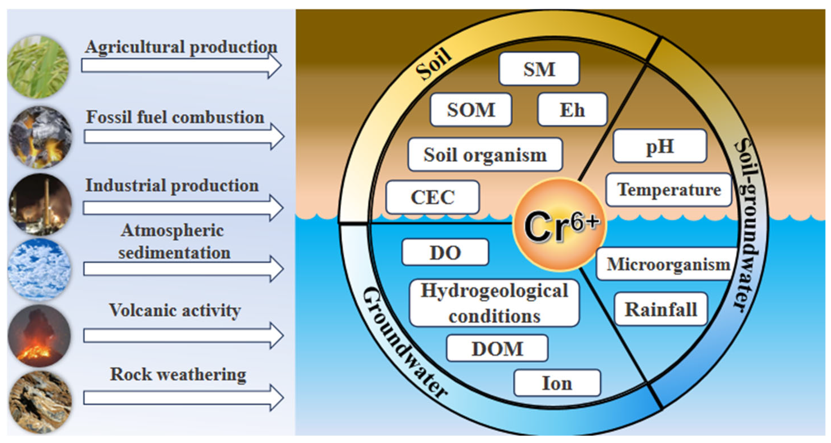 - Mechanistic investigation of multi-factor synergies is urgently needed to deepen the understanding of cooperative mechanisms among physicochemical properties and biological processes during Cr(VI) transport. The behavior of Cr(VI) in coupled water–soil systems is influenced by complex interacting factors. Developing conceptual and numerical models that simulate Cr(VI) transport under varying factor combinations will help quantify the strength and direction of these interactions, providing a theoretical basis for accurate prediction of Cr(VI) dynamics.