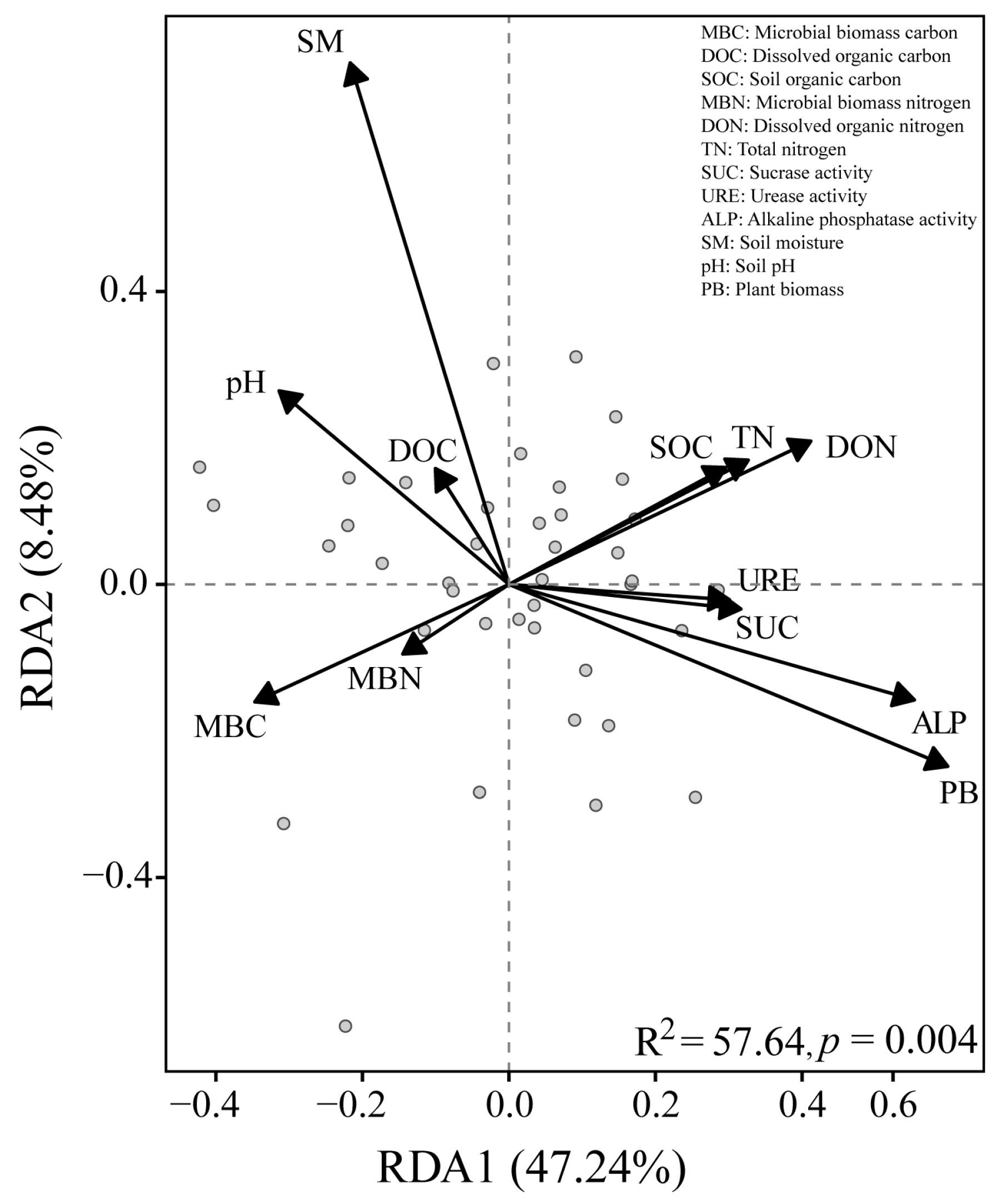 | Soil Properties | pH | Soil Moisture (%) | Soil Organic Carbon (g/kg) | Total Nitrogen (mg/kg) | Dissolved Organic Carbon (mg/kg) | Dissolved Organic Nitrogen (mg/kg) | Microbial Biomass Carbon (mg/kg) | Microbial Biomass Nitrogen (mg/kg) |